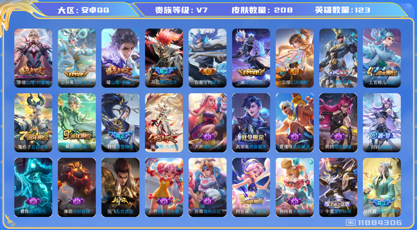 [11884306]V7 9传说 123英雄 208皮肤 可修改实名 优质装备:碎云,山海·炽霜斩(李信年限),山海·苍雷引(电光曜子),澜逐花归海,琥珀纪元马超 传说皮:云诺千山,幻光神枪 珍宝阁皮:胡桃夹子,女武神 限定皮:愿照·九州拓(澜年限),逐霄战戟,鸣野蒿,傲雪梅枪,五谷丰年,梁祝 史诗皮:器灵·浮梦炉,化蝶舞,星界战将,龙之律动,紫霞仙子,苍穹之光,黄金分割率,特工魅影,千年之狐,江河有灵,百解令(蒙犽),高渐离燃音魔法,蒙恬荣光圣徽,无限星赏官,冰冠公主,偶像歌手,电玩·爆裂旋风,暗夜猫娘,龙骑士(小龙虾),末日机甲-吕布,猫狗日记-孙策,猫狗日记-大乔,乱世虎臣,修罗,女仆咖啡,水果甜心,星夜王子,暗隐猎兽者,幽灵船长,鬼剑武藏,心灵战警,舞动绿茵,地狱岩魂,诗语江南,拒霜思,缤纷独角兽,乘风破浪,逐浪之夏,水晶猎龙者,金属风暴,原初追逐者,圣诞狂欢,圣诞恋歌,鹰眼统帅,魅力维加斯,黎明之约,赏金猎手,无心,未来纪元-赵云