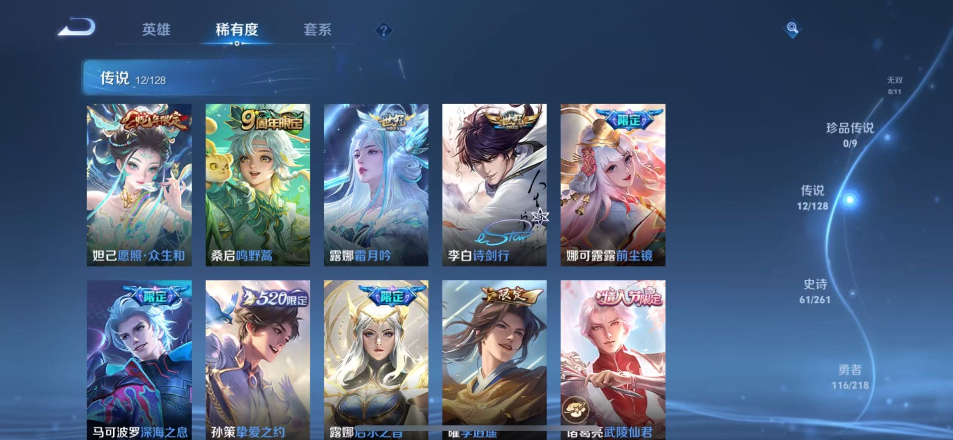 - [11578624]V7 1典藏 5传说 124英雄 162皮肤 可修改实名 优质装备:鸣剑·曳影,地狱火,超时空战士-狄仁杰,鹤羽星尊,玄雷天君 珍宝阁皮:蔷薇恋人 限定皮:五谷丰年,武圣,梁祝,李小龙,猪悟能 史诗皮:化蝶舞,龙之律动,百相守梦-周瑜,茶境仙,百相守梦-黄忠,电玩小子(小书包),黄金分割率,特工魅影,千年之狐,江河有灵,魅语,高渐离燃音魔法,冰冠公主,末日机甲-吕布,节奏热浪,水果甜心,绅士熊喵,天才门将,星夜王子,心灵骇客,功夫厨神,暗隐猎兽者,鬼剑武藏,缤纷独角兽,水晶猎龙者,曙光守护者,金属风暴,圣诞狂欢,圣诞恋歌,鹰眼统帅,暗夜贵公子,魅力维加斯,未来纪元-赵云