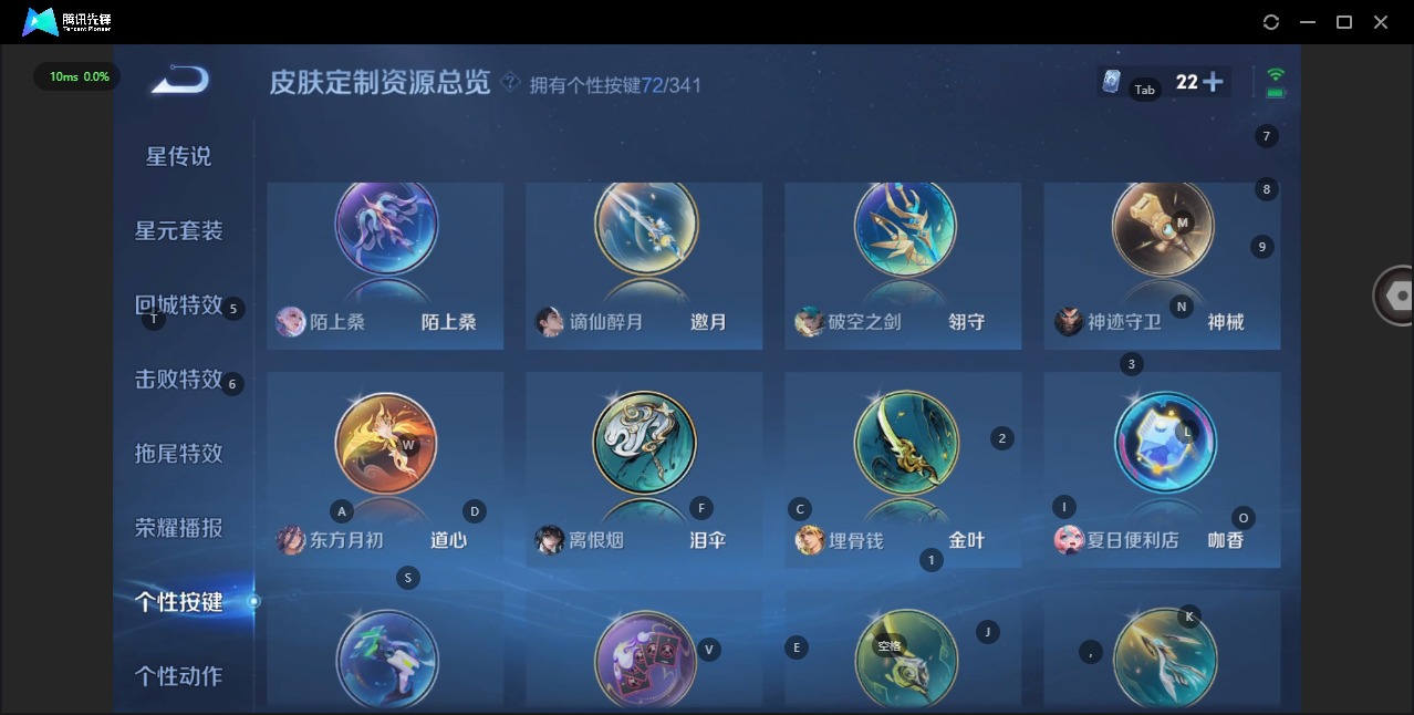 刘备时之恋人,李信一念神魔,孙尚香音你闪耀,露娜霜月吟,庄周牧神诗旅,镜炽阳神光,周瑜音你心动,杨玉环星之鸣奏,宫本武藏惊梅引,裴擒虎祥瑞亨通,嬴政玄雷天君,张良黄金白羊座,孙悟空零号·赤焰,曜云鹰飞将,百里守约碎云,澜逐花归海,虞姬云霓雀翎,铠绛天战甲,赵云淬星耀世,干将莫邪久胜战神,典韦战鼓燎原,干将莫邪画中仙,孙策末日机甲,达摩黄金狮子座,王昭君乞巧织情,鲁班七号时之奇旅,后羿千劫归真,亚连落雪白狼,夏洛特浮生妄,艾琳觅芳踪,西施游龙清影,西施续相思,马超无双飞将,云缨幻光神枪