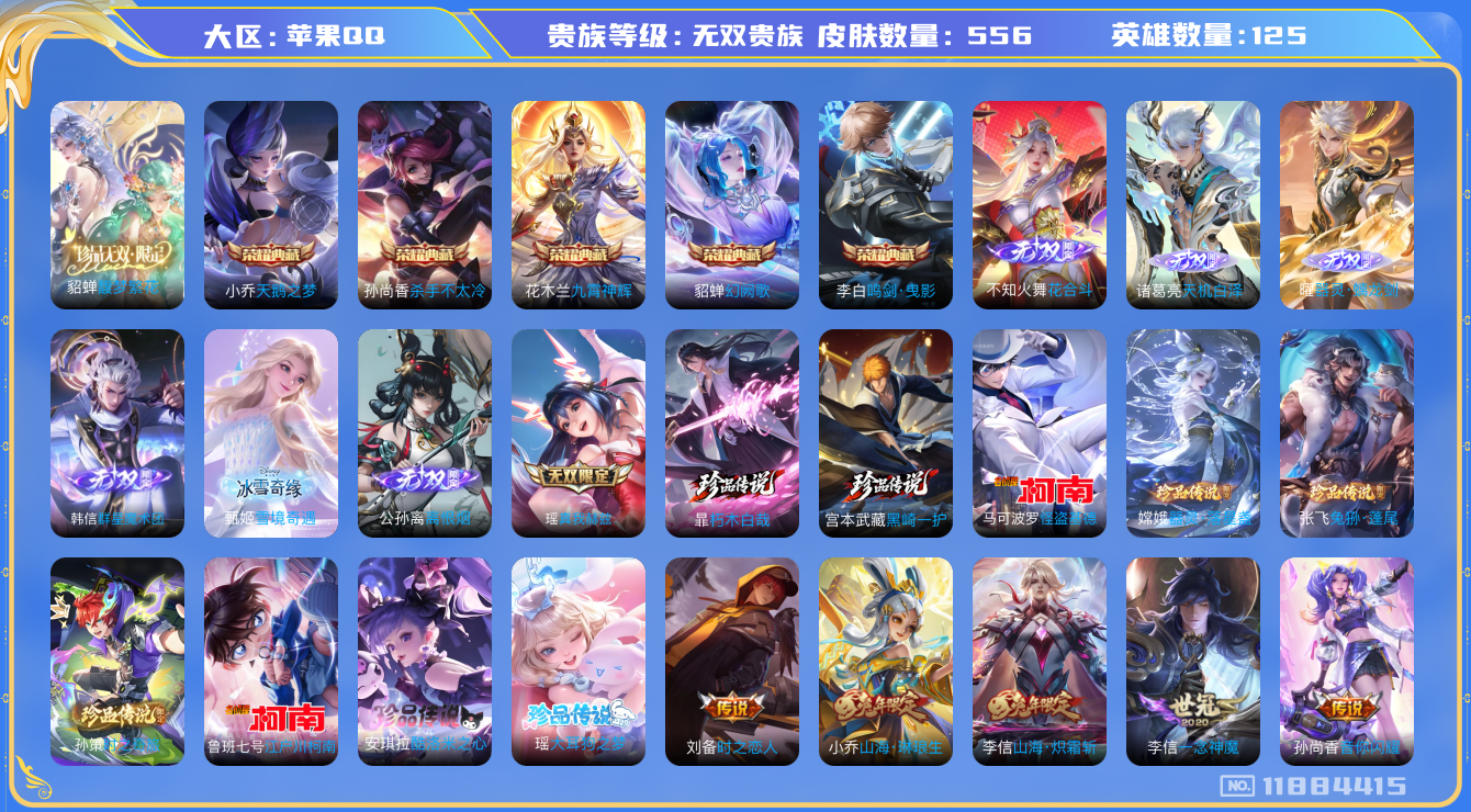 [11884415]无双贵族 5典藏 1珍品无双 7无双 9珍品传说 71传说 125英雄 556皮肤 可修改实名 优质装备:馥梦繁花,天鹅之梦(小乔典藏),杀手不太冷,鸣剑·曳影,九霄神辉(木兰典藏),幻阙歌(貂蝉典藏),真我赫兹(瑶)(瑶无双),韩信群星魔术团(韩信无双),花合斗,离恨烟(公孙离无双),雪境奇遇-甄姬,器灵·螭龙剑,天机白泽,江户川柯南,怪盗基德,器灵·落星盏,酷洛米之心,大耳狗之梦,朽木白哉,黑崎一护,黄金狮子座,黄金射手座,冠军飞将,云鹰飞将(小将军),绛天战甲(鸡嘴战神),黄金白羊座,久胜战神,炽阳神光,一念神魔,云霓雀翎,末日机甲-孙尚香(绿蚂蚱),仲夏夜之梦(大飞蛾),零号·赤焰,地狱之眼,音你心动-周瑜,胖达荣荣,乞巧织情,时之恋人-刘备(电焊工),游龙清影(小青龙),淬星耀世,超时空战士-狄仁杰,末日机甲-孙策,无双飞将,音你闪耀(rap皮),碎云,天秀幻梦,山海·炽霜斩(李信年限),山海·琳琅生(小乔年限),炽翼辉光(娃娃菜牛角包),燃星之曲,画中仙,浮生妄,鹤羽星尊,灼幽烈阳,妄想实况,妄想奇谈,惊梅引,鲁班七号-时之奇旅,霜月吟,澜逐花归海,艾琳觅芳踪,牧神诗旅,玄雷天君,千劫归真,诡秘之主,千山共赴,涂山容容 珍品传说:时之奇旅-孙策,兔狲·蓬尾 传说皮:典韦战鼓燎原,落雪白狼,死亡执政官,九山相柳,云诺千山,续相思,星之鸣奏,祥瑞亨通,幻光神枪 珍宝阁皮:妄想食味,优雅恋人,蔷薇恋人,女武神 限定皮:愿照·九州拓(澜年限),愿照·福禄聚(蔡文姬年限),愿照·岁时盈(虞姬年限),愿照·山河定(司空震年限),愿照·众生和(妲己年限),愿照·千秋盛(女娲年限),逐霄战戟,映山客,陌上桑,鸣野蒿,夏侯惇霜北刀,至尊宝,傲雪梅枪,寅虎·展翼(孙膑年限),白鹤梁神女,神威(电光马子),山海·碧波行(瑶年限),至美·乘鲤谣,至美·化雀舞,遇见飞天,高山流水,诗剑行,怒海麟威,降魔,五谷丰年,冰锋战神,武圣,游园惊梦,梁祝,御风骁将(吕布年限),逐梦之星,烈魂,天狼溯光者,天狼绘梦者,李小龙,朱雀志(守约年限),永曜之星,辉光之辰,霸王别姬-虞姬,默契交锋-花木兰,猪悟能,一生所爱,大圣娶亲,青春决赛季,蜜橘之夏,匿光追影者,寅虎·赤拳(老虎年限),百木心枪,启示之音,时之奇旅-妲己,神器·万象笔,山海·玄木吟(马可年限) 史诗皮:赞萌露比,鸭鸭历险记-