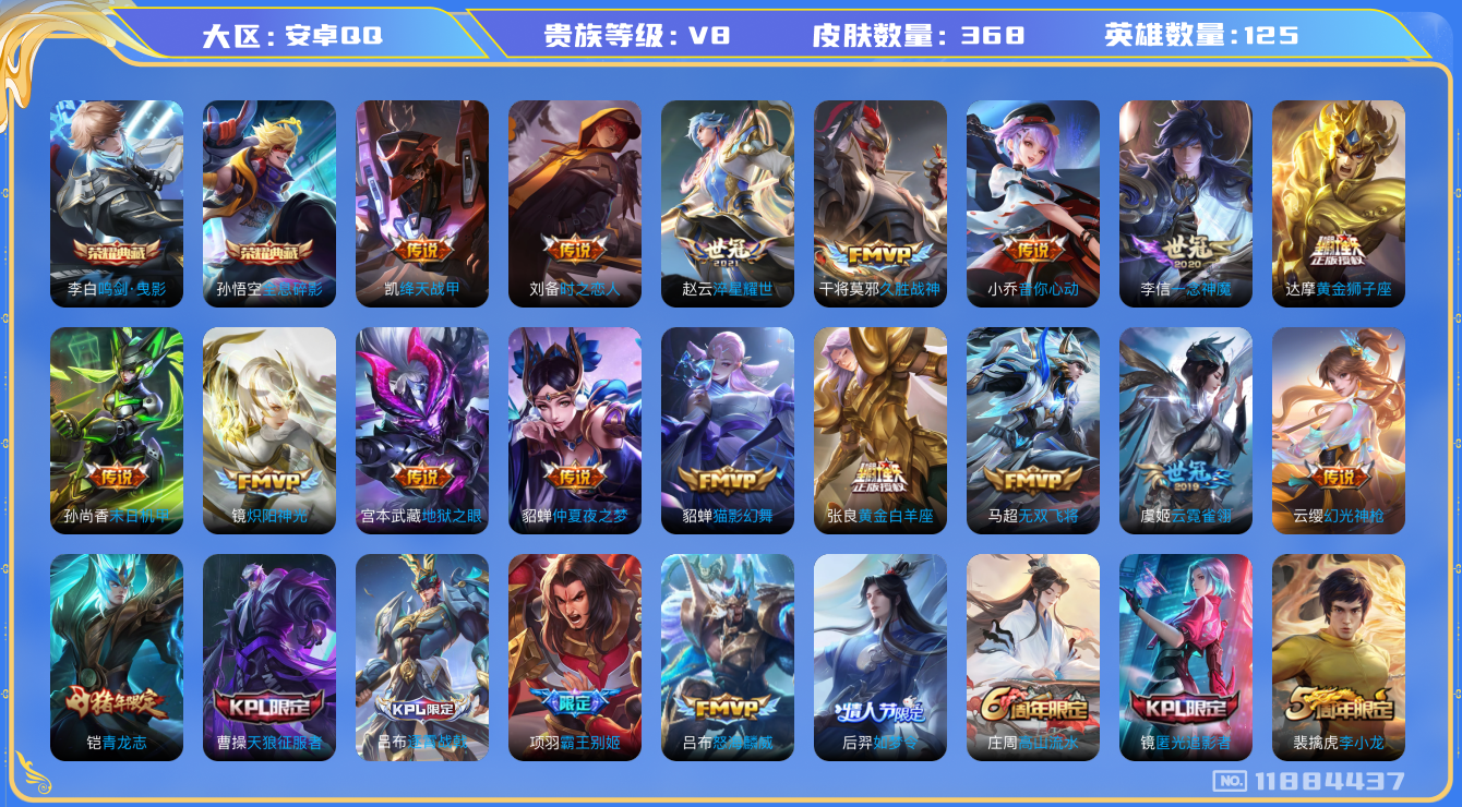 [11884437]V8 2典藏 20传说 125英雄 368皮肤 可修改实名 优质装备:鸣剑·曳影,全息碎影(猴子典藏),黄金狮子座,绛天战甲(鸡嘴战神),黄金白羊座,猫影幻舞,久胜战神,炽阳神光,一念神魔,云霓雀翎,末日机甲-孙尚香(绿蚂蚱),仲夏夜之梦(大飞蛾),音你心动-小乔,地狱之眼,时之恋人-刘备(电焊工),淬星耀世,无双飞将,涂山容容 传说皮:幻光神枪 珍宝阁皮:女武神,玩趣恶龙 限定皮:逐霄战戟,鸣野蒿,至尊宝,凤求凰(白切鸡),傲雪梅枪,时之彼端,飞衡(韩信年限),高山流水,怒海麟威,五谷丰年,青龙志(铠年限),冰锋战神,天狼征服者,天狼绘梦者,李小龙,如梦令-嫦娥,如梦令-后羿,霸王别姬-项羽,霸王别姬-虞姬,默契交锋-花木兰,孙行者,猪悟能,青春决赛季,匿光追影者 史诗皮:石田雨龙,百相守梦-百里守约,百相守梦-黄忠,织梦人,紫霞仙子,苍穹之光,电玩小子(小书包),白龙吟,黄金分割率,特工魅影,千年之狐,永昼,江河有灵,魅语,百解令(蒙犽),高渐离燃音魔法,无限星赏官,冰冠公主,青蛇,偶像歌手,白蛇,晚萤,电玩·爆裂旋风,暗夜猫娘,龙骑士(小龙虾),末日机甲-吕布,猫狗日记-孙策,猫狗日记-大乔,时之恋人-孙尚香,乱世虎臣,节奏热浪,修罗,女仆咖啡,摇滚巨星,水果甜心,绅士熊喵,天才门将,星夜王子,心灵骇客,时之奇旅-安琪拉,功夫厨神,德古拉伯爵,暗隐猎兽者,幽灵船长,鬼剑武藏,暗渊魔法,心灵战警,乐园奇幻夜,天秀·启明,舞动绿茵,地狱岩魂,诗语江南,纤云弄巧,繁星吟游(呼啦呼啦),拒霜思,缤纷独角兽,乘风破浪,逐浪之夏,龙鼓争鸣,月团寄思,水晶猎龙者,曙光守护者,热力回旋,箭羽风息,金属风暴,原初追逐者,圣诞狂欢,圣诞恋歌,鹰眼统帅,暗夜贵公子,魅力维加斯,黎明之约,雪上飞焰,奇遇舞章,无心,未来纪元-赵云