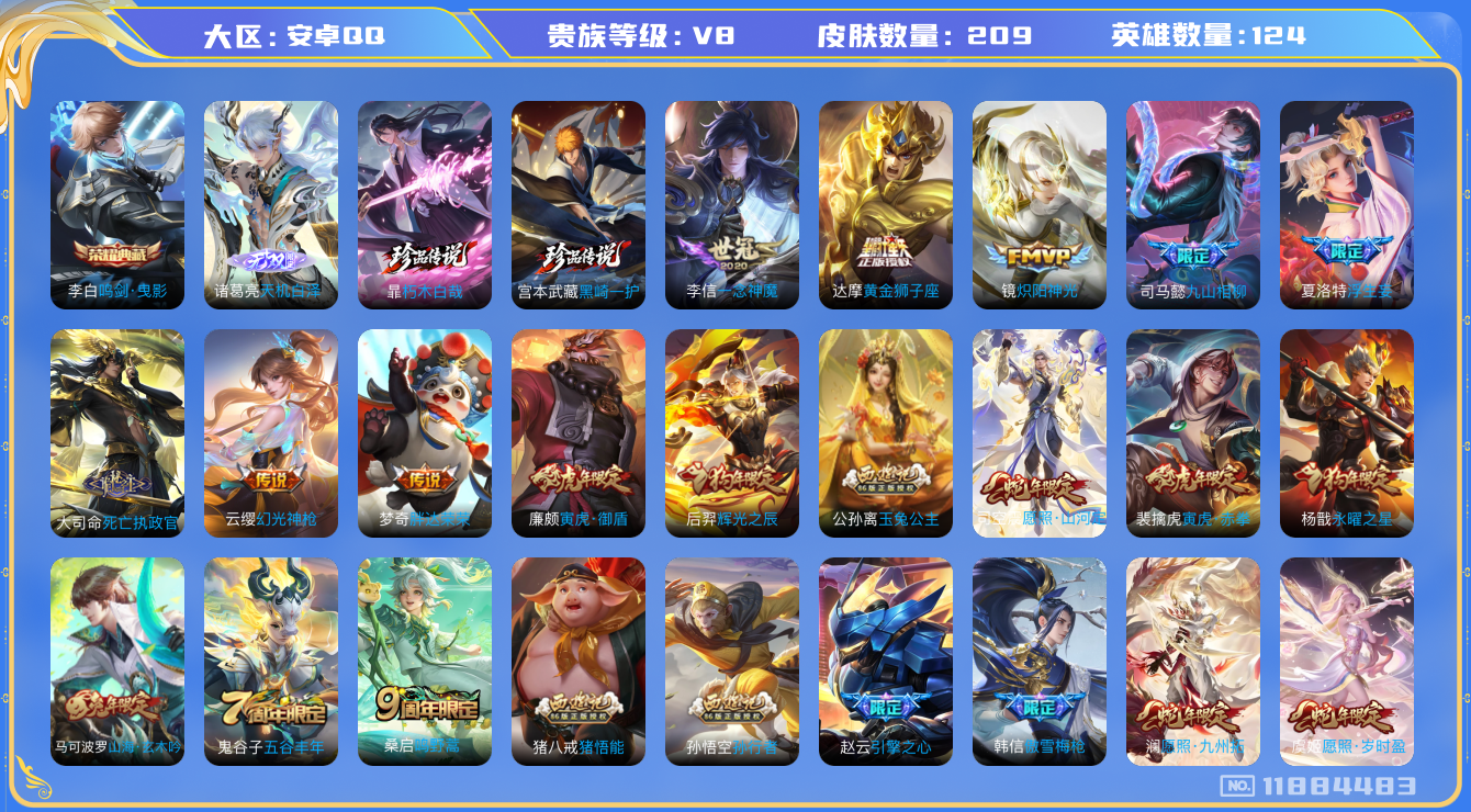[11884483]V8 1典藏 1无双 2珍品传说 15传说 124英雄 209皮肤 可修改实名 优质装备:鸣剑·曳影,天机白泽,朽木白哉,黑崎一护,黄金狮子座,炽阳神光,一念神魔,胖达荣荣,浮生妄,涂山容容 传说皮:死亡执政官,九山相柳,幻光神枪 珍宝阁皮:妄想食味,玩趣恶龙 限定皮:愿照·九州拓(澜年限),愿照·岁时盈(虞姬年限),愿照·山河定(司空震年限),鸣野蒿,傲雪梅枪,五谷丰年,永曜之星,辉光之辰,孙行者,猪悟能,引擎之心,寅虎·御盾(廉颇年限),寅虎·赤拳(老虎年限),玉兔公主,山海·玄木吟(马可年限) 史诗皮:鸭鸭历险记-刘禅,器灵·浮梦炉,糖绘人间,狼魂孤将,化蝶舞,星界战将,谪仙醉月,龙之律动,藏狐·褐绒,石田雨龙,百相守梦-周瑜,茶境仙,幻珠鲛人,破空之剑,埋骨钱,芈月浮光幕影,上官婉儿群星魔术团,百相守梦-黄忠,紫霞仙子,黄金分割率,特工魅影,千年之狐,永昼,江河有灵,魅语,蒙恬荣光圣徽,冰冠公主,青蛇,偶像歌手,晚萤,末日机甲-吕布,猫狗日记-孙策,时之恋人-孙尚香,乱世虎臣,修罗,女仆咖啡,水果甜心,星夜王子,德古拉伯爵,暗隐猎兽者,幽灵船长,鬼剑武藏,天秀·启明,缤纷独角兽,乘风破浪,龙鼓争鸣,水晶猎龙者,曙光守护者,热力回旋,箭羽风息,原初追逐者,圣诞狂欢,鹰眼统帅,魅力维加斯,赏金猎手,滕王阁序,寅虎·御盾,无心