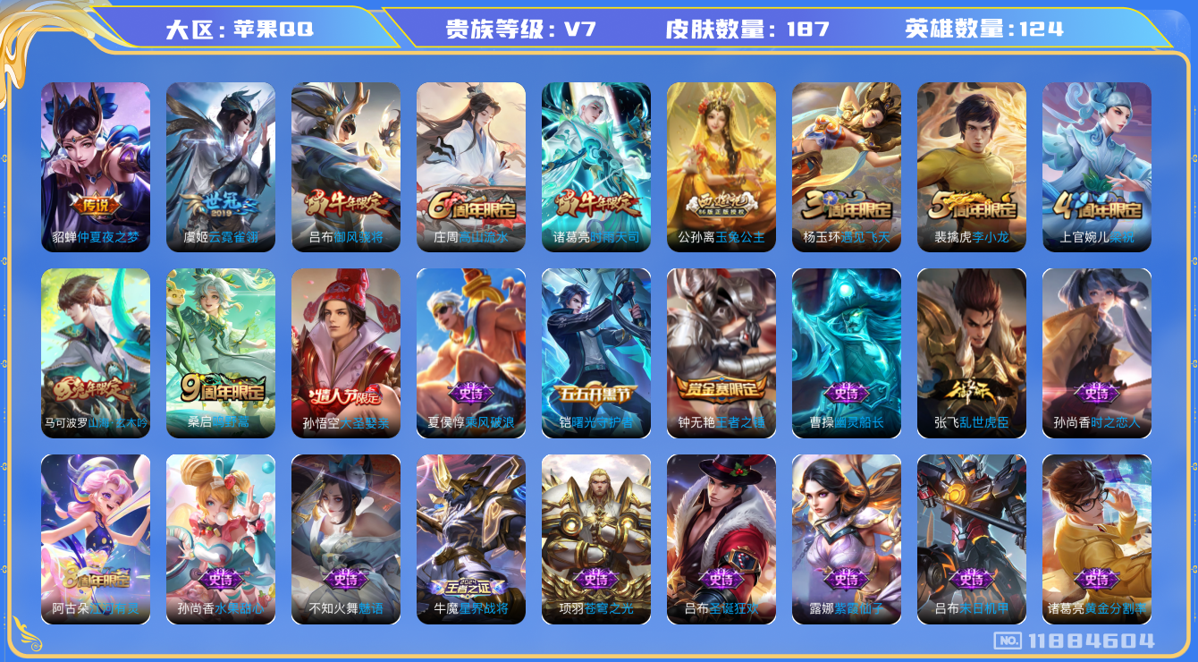- [11625986]V7 1典藏 11传说 124英雄 291皮肤 可修改实名 优质装备:鸣剑·曳影,黄金射手座,黄金白羊座,一念神魔,仲夏夜之梦(大飞蛾),地狱之眼,澜逐花归海 传说皮:祥瑞亨通 珍宝阁皮:妄想食味,优雅恋人,蔷薇恋人 限定皮:愿照·九州拓(澜年限),愿照·岁时盈(虞姬年限),陌上桑,鸣野蒿,至尊宝,傲雪梅枪,遇见飞天,高山流水,诗剑行,五谷丰年,梁祝,李小龙,孙行者,猪悟能,大圣娶亲,神器·万象笔,山海·玄木吟(马可年限) 史诗皮:绮世丹青,化蝶舞,星界特工,星界战将,灵蛊蚀心,龙之律动,破空之剑,蒙犽顽岩魄,谪仙醉月,上官婉儿群星魔术团,炽弈燎原,百相守梦-黄忠,紫霞仙子,苍穹之光,电玩小子(小书包),白龙吟,黄金分割率,特工魅影,千年之狐,真我赫兹(镜),真我赫兹(百里守约),匿光侦查者,江河有灵,蒙恬荣光圣徽,偶像歌手,龙骑士(小龙虾),白蛇,暗夜猫娘,魅语,晚萤,冰冠公主,末日机甲-吕布,猫狗日记-孙策,时之恋人-孙尚香,乱世虎臣,节奏热浪,修罗,女仆咖啡,摇滚巨星,水果甜心,天才门将,星夜王子,心灵骇客,功夫厨神,德古拉伯爵,暗隐猎兽者,幽灵船长,鬼剑武藏,心灵战警,舞动绿茵,地狱岩魂,纤云弄巧,繁星吟游(呼啦呼啦),拒霜思,缤纷独角兽,乘风破浪,逐浪之夏,月团寄思,水晶猎龙者,曙光守护者,金属风暴,原初追逐者,圣诞狂欢,圣诞恋歌,鹰眼统帅,暗夜贵公子,魅力维加斯,黎明之约,赏金猎手,无心,未来纪元-赵云