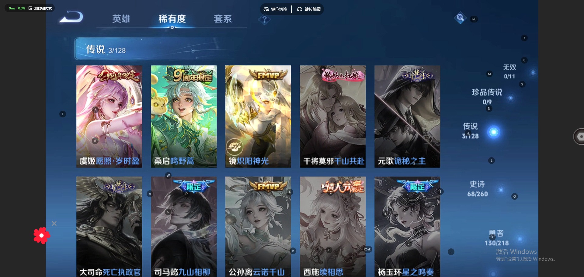 - [11795567]V7 1典藏 1珍品传说 8传说 123英雄 278皮肤 可修改实名 优质装备:鸣剑·曳影,怪盗基德,炽阳神光,一念神魔,涂山容容 传说皮:云诺千山,幻光神枪 珍宝阁皮:蔷薇恋人,女武神,玩趣恶龙 限定皮:愿照·九州拓(澜年限),愿照·山河定(司空震年限),逐霄战戟,鸣野蒿,异界灵契(白毛香),傲雪梅枪,遇见飞天,高山流水,五谷丰年,游园惊梦,梁祝,李小龙,大圣娶亲 史诗皮:鸭鸭历险记-刘禅,器灵·浮梦炉,狼魂孤将,绮世丹青,化蝶舞,星界战将,谪仙醉月,龙之律动,石田雨龙,茶境仙,破空之剑,蒙犽顽岩魄,百相守梦-百里守约,紫霞仙子,白龙吟,特工魅影,千年之狐,江河有灵,冰冠公主,青蛇,偶像歌手,暗夜猫娘,猫狗日记-孙策,时之恋人-孙尚香,节奏热浪,女仆咖啡,水果甜心,绅士熊喵,星夜王子,心灵骇客,德古拉伯爵,暗隐猎兽者,幽灵船长,鬼剑武藏,心灵战警,乐园奇幻夜,地狱岩魂,纤云弄巧,繁星吟游(呼啦呼啦),拒霜思,缤纷独角兽,乘风破浪,逐浪之夏,水晶猎龙者,曙光守护者,箭羽风息,金属风暴,圣诞狂欢,鹰眼统帅,魅力维加斯,黎明之约,未来纪元-赵云,玫瑰异探