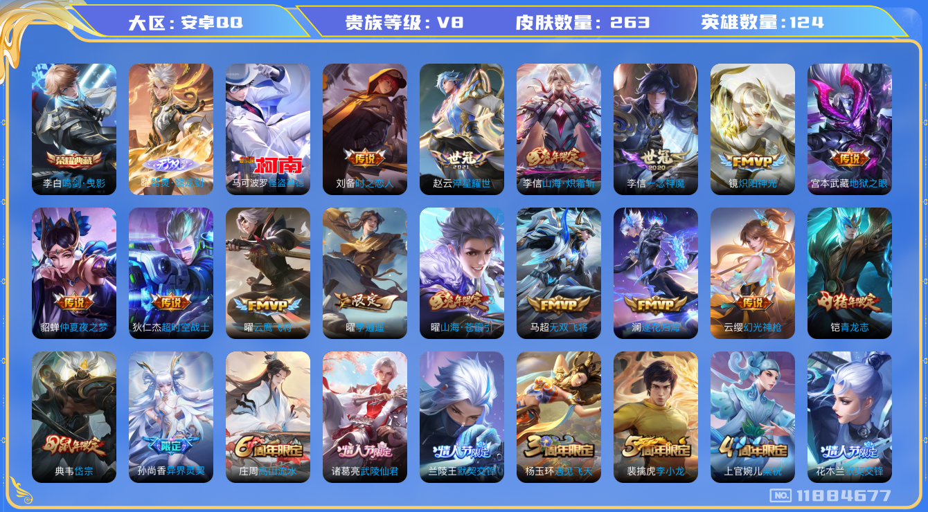 [11884677]V8 1典藏 1无双 1珍品传说 22传说 124英雄 263皮肤 可修改实名 优质装备:鸣剑·曳影,器灵·螭龙剑,怪盗基德,云鹰飞将(小将军),炽阳神光,一念神魔,仲夏夜之梦(大飞蛾),地狱之眼,李逍遥,时之恋人-刘备(电焊工),淬星耀世,超时空战士-狄仁杰,无双飞将,山海·炽霜斩(李信年限),山海·苍雷引(电光曜子),澜逐花归海 传说皮:幻光神枪 珍宝阁皮:万物之道,蔷薇恋人,玩趣恶龙 限定皮:愿照·九州拓(澜年限),鸣野蒿,白虎志(电光耗子),武陵仙君(小桃花),异界灵契(白毛香),傲雪梅枪,神威(电光马子),山海·碧波行(瑶年限),遇见飞天,高山流水,齐天大圣,五谷丰年,青龙志(铠年限),梁祝,岱宗(典韦年限),李小龙,朱雀志(守约年限),默契交锋-兰陵王,默契交锋-花木兰,孙行者,大圣娶亲,山海·玄木吟(马可年限) 史诗皮:器灵·浮梦炉,化蝶舞,破空之剑,百相守梦-百里守约,百相守梦-黄忠,织梦人,紫霞仙子,电玩小子(小书包),白龙吟,特工魅影,千年之狐,永昼,江河有灵,鹤归松栖(赵怀真),百解令(蒙犽),高渐离燃音魔法,蒙恬荣光圣徽,冰冠公主,偶像歌手,白蛇,晚萤,电玩·爆裂旋风,末日机甲-吕布,猫狗日记-孙策,猫狗日记-大乔,时之恋人-孙尚香,乱世虎臣,节奏热浪,修罗,女仆咖啡,摇滚巨星,水果甜心,绅士熊喵,天才门将,星夜王子,心灵骇客,时之奇旅-安琪拉,功夫厨神,暗隐猎兽者,幽灵船长,鬼剑武藏,心灵战警,天秀·启明,舞动绿茵,地狱岩魂,纤云弄巧,拒霜思,缤纷独角兽,乘风破浪,逐浪之夏,水晶猎龙者,曙光守护者,箭羽风息,唤灵魅影,金属风暴,圣诞狂欢,圣诞恋歌,鹰眼统帅,赏金猎手,无心,未来纪元-赵云