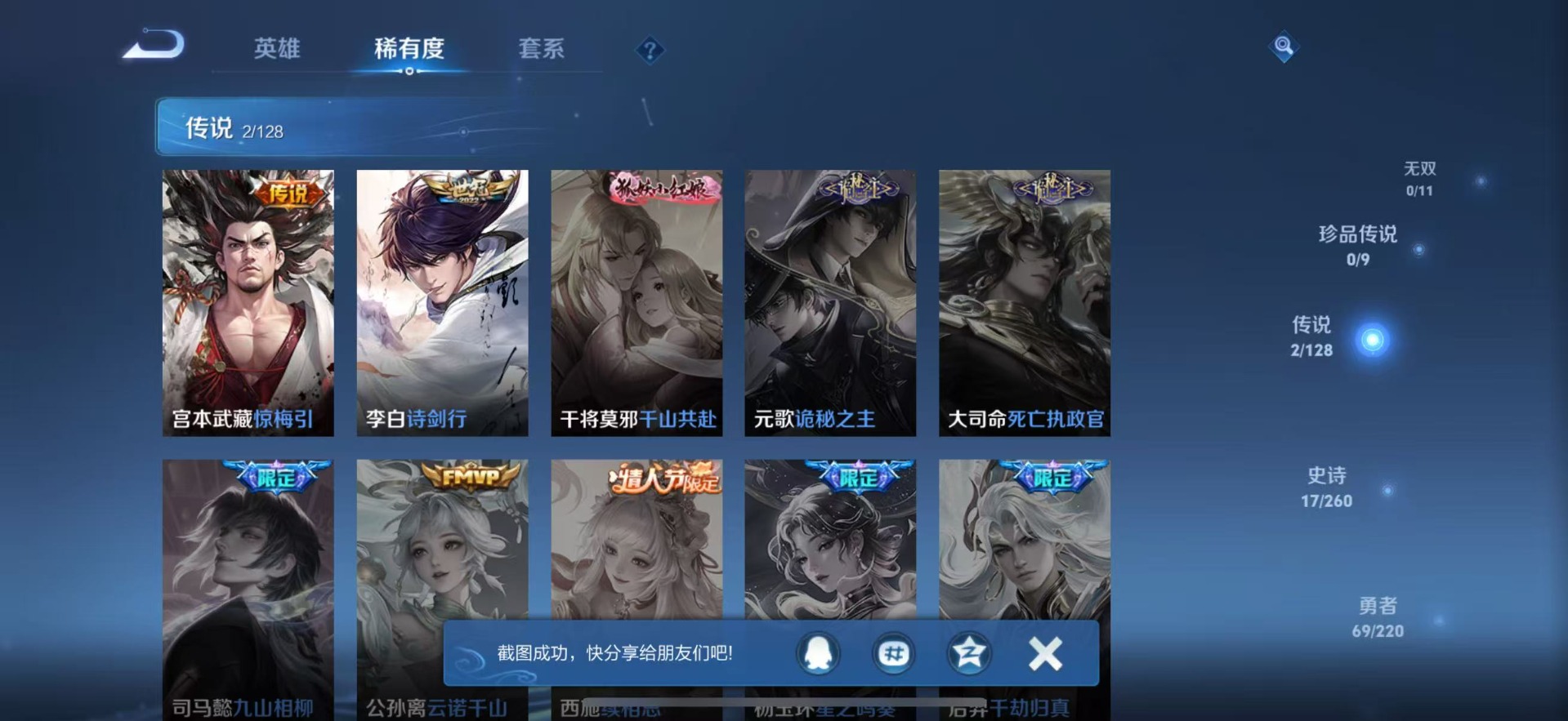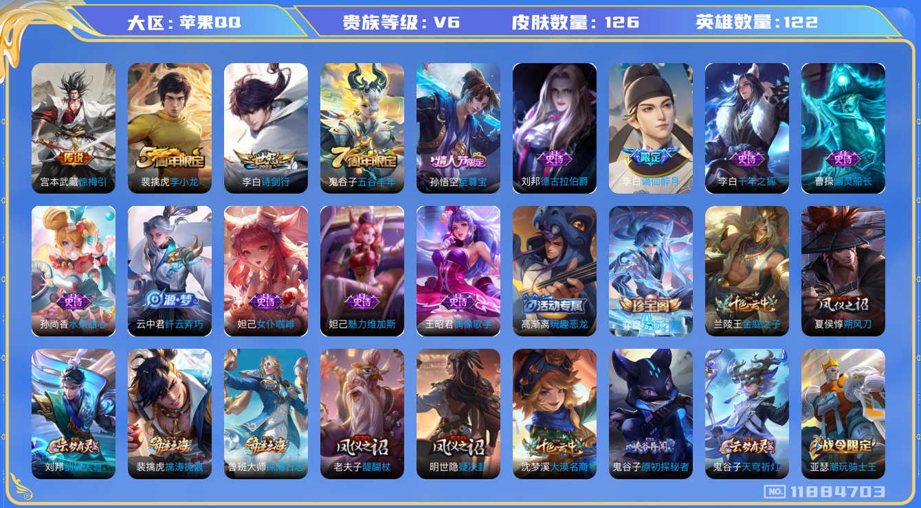 [11884703]V6 2传说 122英雄 126皮肤 可修改实名 优质装备:惊梅引 珍宝阁皮:万物之道,玩趣恶龙 限定皮:至尊宝,诗剑行,五谷丰年,李小龙 史诗皮:谪仙醉月,千年之狐,偶像歌手,女仆咖啡,水果甜心,德古拉伯爵,幽灵船长,纤云弄巧,魅力维加斯