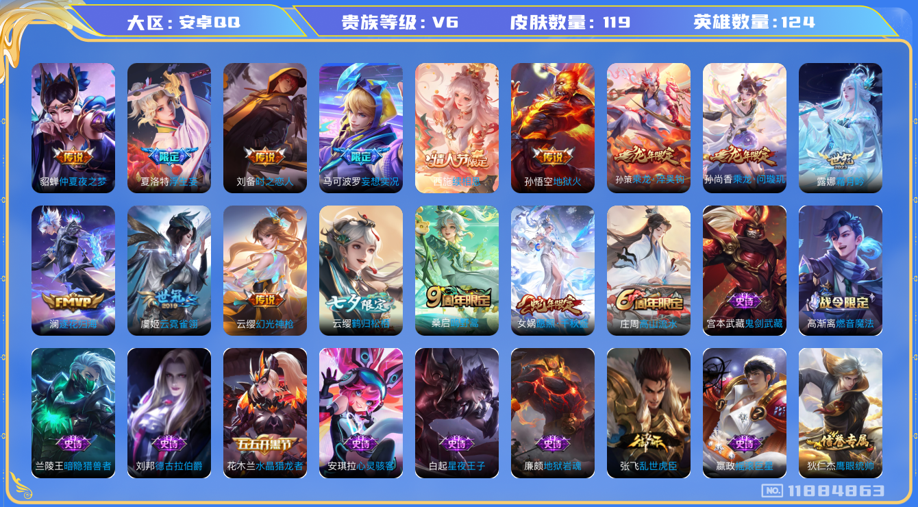 [11884863]V6 15传说 124英雄 119皮肤 可修改实名 优质装备:云霓雀翎,地狱火,仲夏夜之梦(大飞蛾),时之恋人-刘备(电焊工),浮生妄,妄想实况,鹤归松栖(云缨),霜月吟,澜逐花归海 传说皮:乘龙·问璇玑(孙尚香年限),乘龙·淬吴钩(孙策年限),续相思,幻光神枪 珍宝阁皮:妄想食味 限定皮:愿照·千秋盛(女娲年限),鸣野蒿,高山流水 史诗皮:龙之律动,石田雨龙,涂山红红,蔬乡物语(鲁班七号),遇见神鹿,江河有灵,高渐离燃音魔法,冰冠公主,末日机甲-吕布,猫狗日记-孙策,乱世虎臣,摇滚巨星,水果甜心,天才门将,星夜王子,心灵骇客,德古拉伯爵,暗隐猎兽者,鬼剑武藏,舞动绿茵,地狱岩魂,逐浪之夏,水晶猎龙者,原初追逐者,鹰眼统帅,魅力维加斯