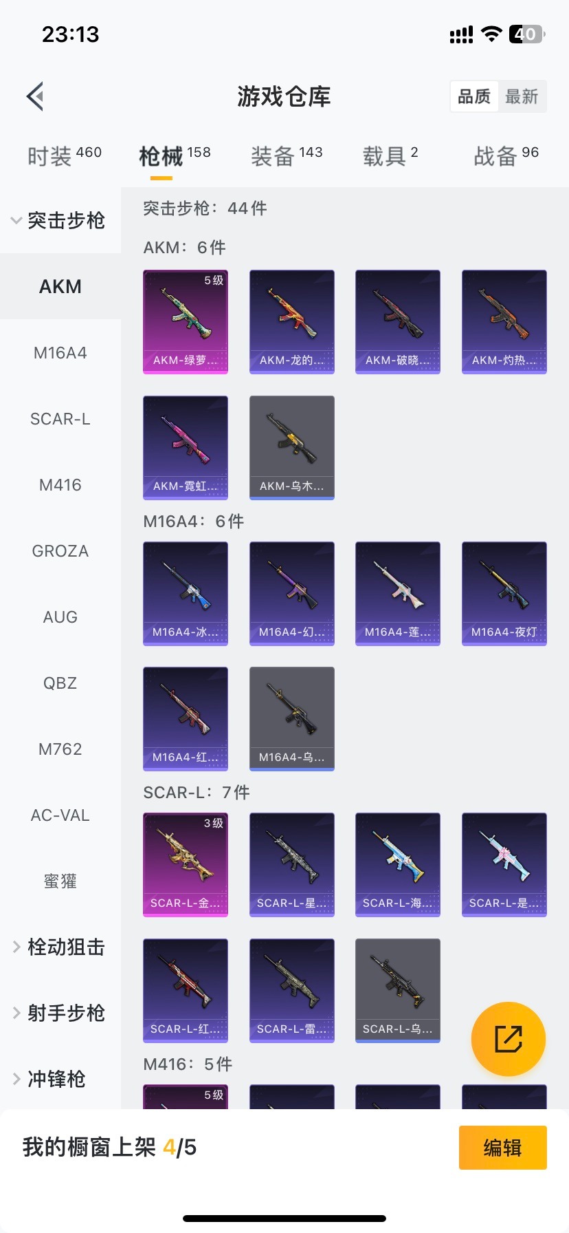 AKM-绿萝繁花,SCAR-L-金蛇镇世,M416-电玩时刻,GROZA-镜光银凌,AUG-暖羊咩咩,Kar98K-巳巳如意,Mk14-盛世惊鸿