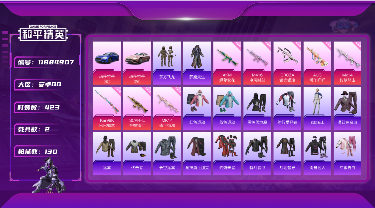 - PX_2093733- 安卓手Q-11王牌印记-5粉装-3特效枪-2载具-65648热力值-150套装-209枪皮-1卓越印记-0传奇印记 【5粉装】,梦幻火箭,冷漠罗丽,飒粉甜心,复仇流浪者,莲影清波 【3特效枪】M416-风花雪月-7级 Kar98K-巳巳如意-5级 汤姆逊-怪笑疯兔-6级 【4稀有紫装】,浪漫天命,龟仙人,许七安,怀庆长公主, 【2稀有载具】,仰望U9(赤霞丹朱),鬼马风驰