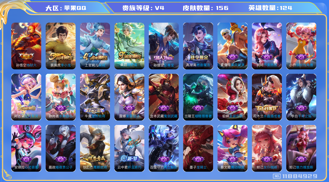 [11884929]V4 2传说 124英雄 156皮肤 可修改实名 优质装备:地狱火 珍宝阁皮:蔷薇恋人 限定皮:鸣野蒿,至尊宝,梁祝,李小龙 史诗皮:星界战将,龙之律动,紫霞仙子,特工魅影,千年之狐,江河有灵,高渐离燃音魔法,龙骑士(小龙虾),节奏热浪,女仆咖啡,水果甜心,心灵骇客,暗隐猎兽者,鬼剑武藏,舞动绿茵,纤云弄巧,缤纷独角兽,乘风破浪,水晶猎龙者,圣诞恋歌,鹰眼统帅,暗夜贵公子,魅力维加斯