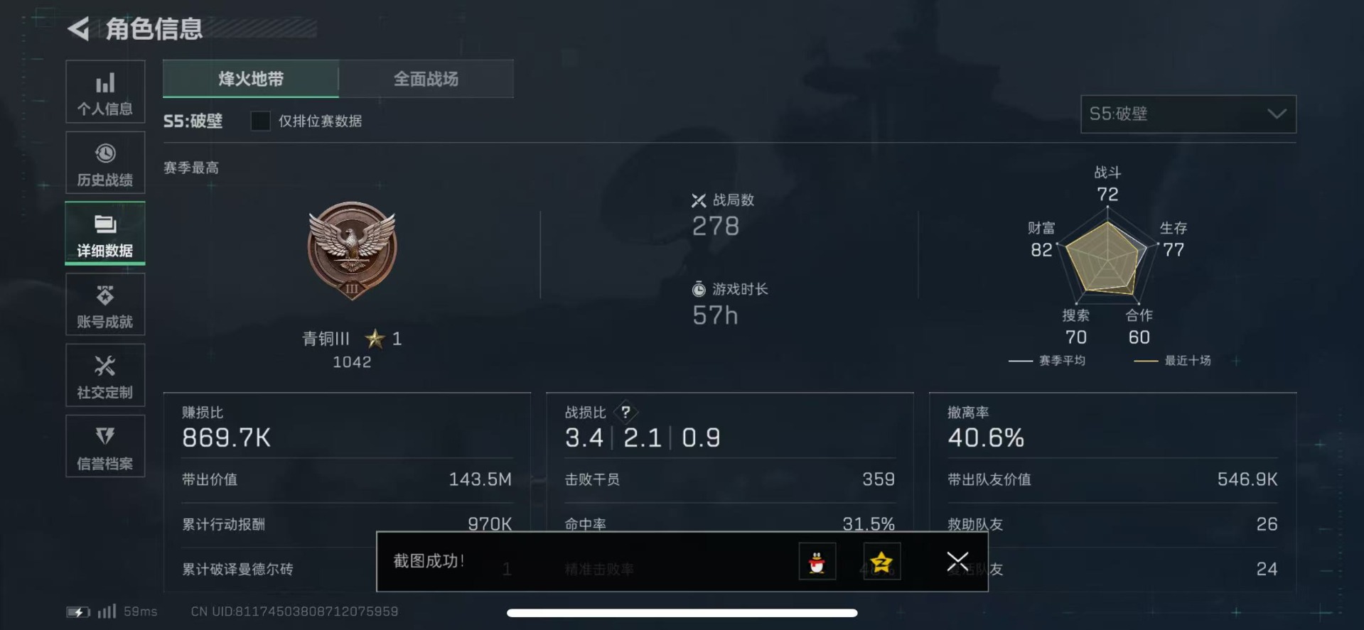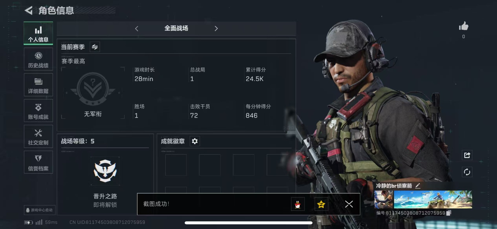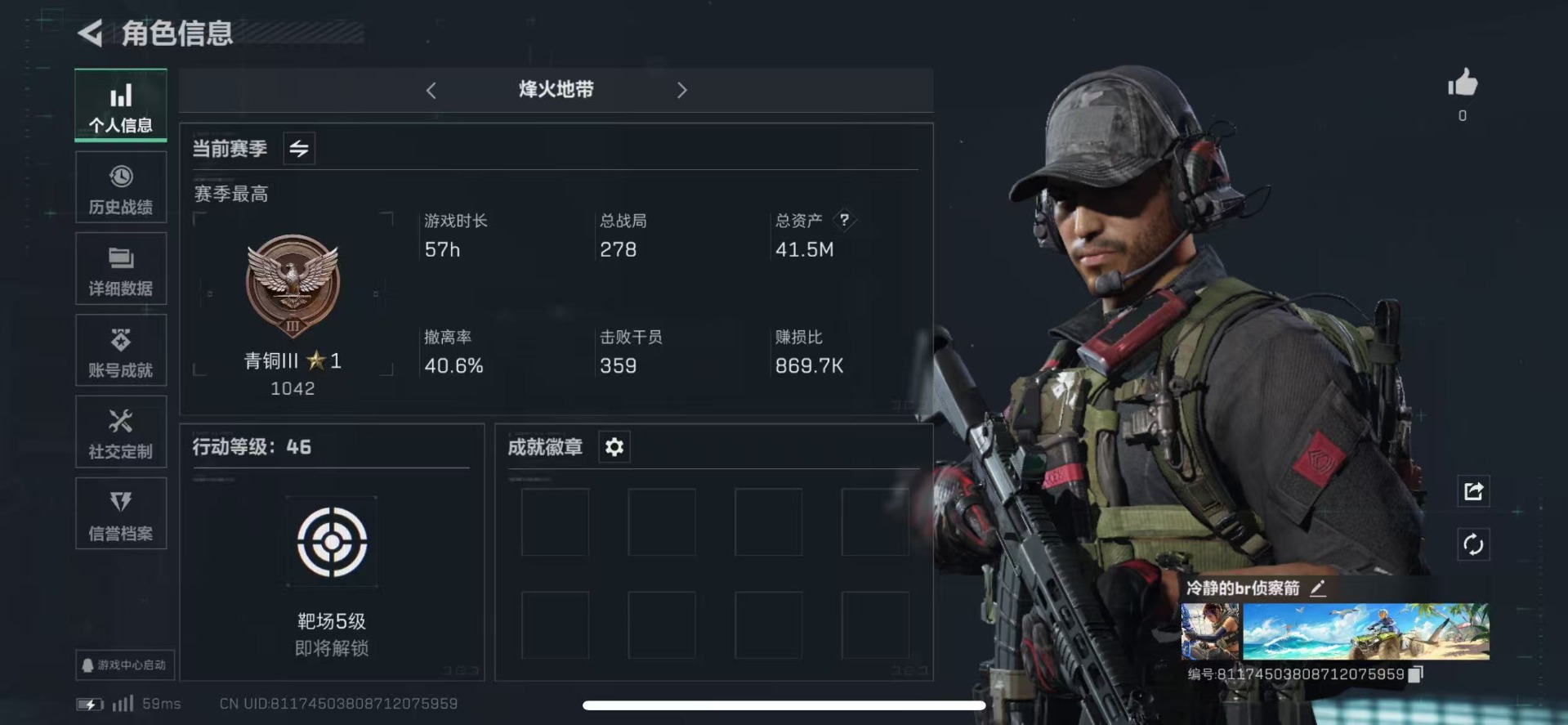 [11884972]总资产:41.5M 6传说枪械 哈夫币:18.732K 可二次 可修改实名 烽火地带段位:青铜 全面战场段位:无段位 传说武器皮肤:M16A4突击步枪-狩猎时刻,勇士冲锋枪-能天使-午夜邮差,Vector冲锋枪-狩猎时刻,G3战斗步枪-狩猎时刻,复合弓-黑-天际线,CAR-15突击步枪-阿米娅