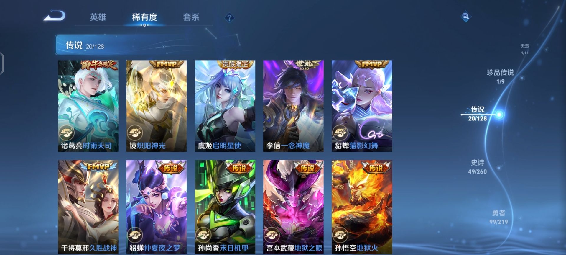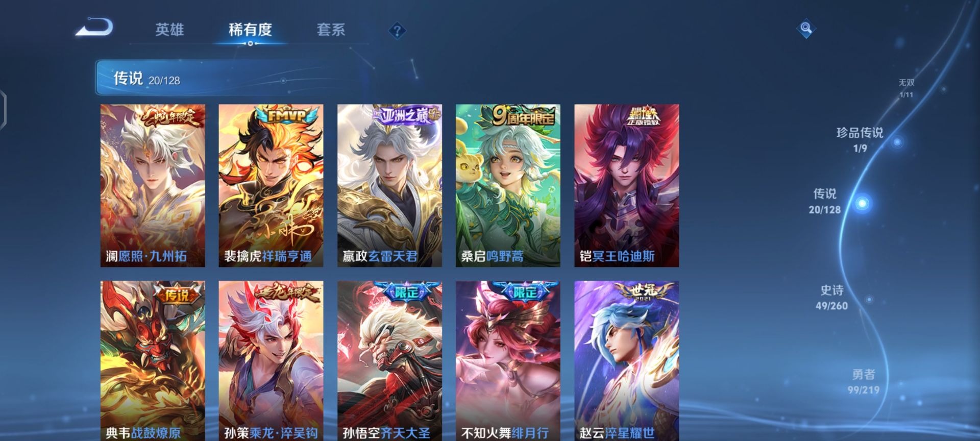- [12145991]猴子典藏,久胜,紫霞,-可二次-108英雄-165皮肤-1典藏-7传说-31史诗 辉光之辰-后羿 街头霸王-韩信