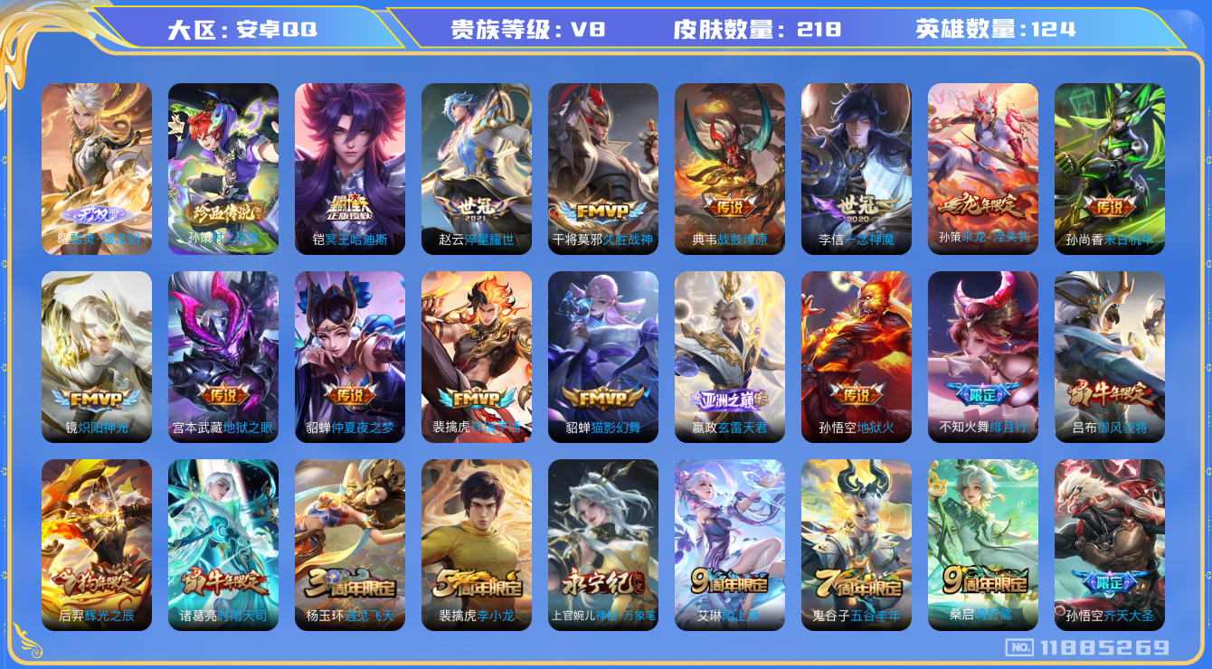 - [11651481]V7 7传说 124英雄 202皮肤 可修改实名 优质装备:黄金狮子座,黄金射手座,碎云 珍宝阁皮:优雅恋人,玩趣恶龙 限定皮:愿照·九州拓(澜年限),愿照·千秋盛(女娲年限),鸣野蒿,遇见飞天,高山流水,齐天大圣,五谷丰年,游园惊梦,李小龙,逐梦之影,朱雀志(守约年限),孙行者,乒乒小将,深海之息(深海大菠萝) 史诗皮:苍鳞隐世,狼魂孤将,化蝶舞,特工魅影,千年之狐,魅语,百解令(蒙犽),无限星赏官,末日机甲-吕布,猫狗日记-孙策,乱世虎臣,修罗,水果甜心,德古拉伯爵,暗隐猎兽者,幽灵船长,心灵战警,纤云弄巧,拒霜思,逐浪之夏,水晶猎龙者,曙光守护者,热力回旋,金属风暴,鹰眼统帅,魅力维加斯,无心,未来纪元-赵云