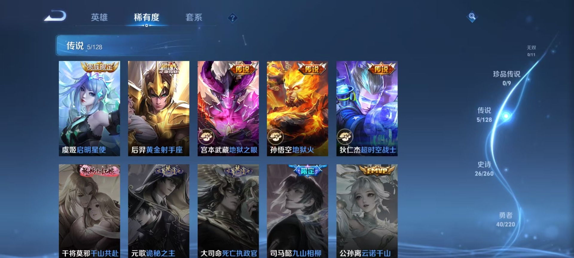 - [11294259]V8 1典藏 1珍品传说 11传说 126英雄 311皮肤 典藏英雄武则天 可修改实名 优质装备:全息碎影(猴子典藏),冠军飞将,末日机甲-孙尚香(绿蚂蚱),地狱火,海洋之心,超时空战士-狄仁杰 珍品传说:时之奇旅-孙策 珍宝阁皮:蔷薇恋人 限定皮:愿照·众生和(妲己年限),鸣野蒿,白虎志(电光耗子),凤求凰(白切鸡),太华(伽罗年限),梅西,飞衡(韩信年限),瑞麟志(木兰年限),遇见飞天,五谷丰年,青龙志(铠年限),冰锋战神,梁祝,逐梦之翼,岱宗(典韦年限),逐梦之光,玄武志(苏烈年限),朱雀志(守约年限),奇迹圣诞,一生所爱,大圣娶亲,青春决赛季,冰霜恋舞曲,神奇女侠 史诗皮:星界战将,苍鳞隐世,器灵·浮梦炉,百相守梦-百里守约,百相守梦-黄忠,战舞者,怒海争锋,蔬乡物语(鲁班七号),破空之剑,紫霞仙子,苍穹之光,黄金分割率,特工魅影,千年之狐,高渐离燃音魔法,冰冠公主,青蛇,偶像歌手,百相守梦(刘备),末日机甲-吕布,猫狗日记-孙策,猫狗日记-大乔,乱世虎臣,节奏热浪,女仆咖啡,摇滚巨星,水果甜心,绅士熊喵,天才门将,星夜王子,心灵骇客,功夫厨神,德古拉伯爵,暗隐猎兽者,幽灵船长,鬼剑武藏,暗渊魔法,心灵战警,舞动绿茵,地狱岩魂,纤云弄巧,缤纷独角兽,乘风破浪,逐浪之夏,月团寄思,水晶猎龙者,曙光守护者,箭羽风息,金属风暴,原初追逐者,圣诞狂欢,圣诞恋歌,鹰眼统帅,暗夜贵公子,魅力维加斯,黎明之约,未来纪元-赵云