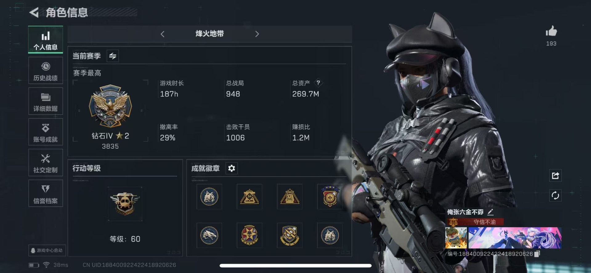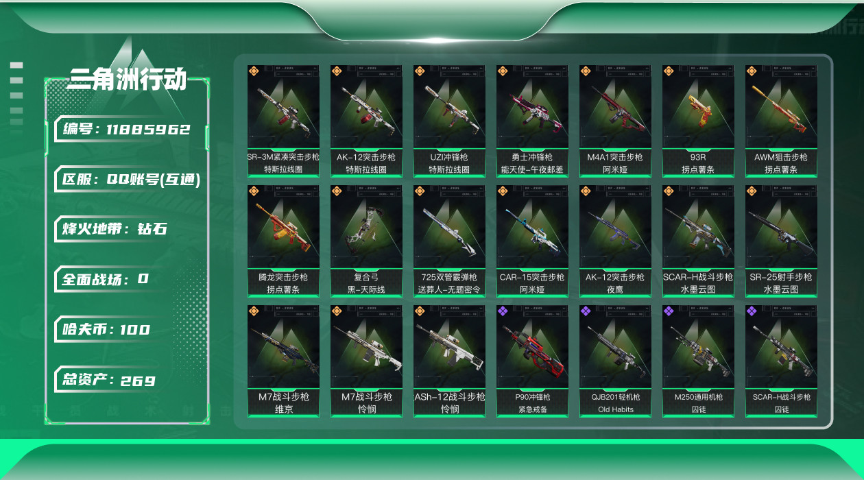 [11885962]总资产:269.7M 17传说枪械 哈夫币:100K 可二次 可修改实名 优质装备:顶级安全箱(3x3) 烽火地带段位:钻石 全面战场段位:列兵 传说武器皮肤:SR-25射手步枪-水墨云图,SCAR-H战斗步枪-水墨云图,UZI冲锋枪-特斯拉线圈,AWM狙击步枪-捞点薯条,腾龙突击步枪-捞点薯条,93R-捞点薯条,AK-12突击步枪-特斯拉线圈,SR-3M紧凑突击步枪-特斯拉线圈,勇士冲锋枪-能天使-午夜邮差,复合弓-黑-天际线,725双管霰弹枪-送葬人-无题密令,M4A1突击步枪-阿米娅,CAR-15突击步枪-阿米娅,AK-12突击步枪-夜鹰,M7战斗步枪-维京,M7战斗步枪-怜悯,ASh-12战斗步枪-怜悯 史诗武器皮肤:SR-3M紧凑突击步枪-英雄,PKM通用机枪-蝮蛇,AUG突击步枪-蝮蛇,M700狙击步枪-蝮蛇,G3战斗步枪-战场英杰,SG552突击步枪-尖端治疗,QJB201轻机枪-Old Habits,M1014霰弹枪-林中猎手,PKM通用机枪-守夜人,AS Val突击步枪-尖端治疗,M700狙击步枪-守夜人,Ash-12战斗步枪-守夜人,SR-25射手步枪-尖端治疗,MP5冲锋枪-深海恐惧,勇士冲锋枪-深海恐惧,SG552突击步枪-深海恐惧,AKM突击步枪-林中猎手,M16A4突击步枪-竞赛选手,M250通用机枪-囚徒,SV-98狙击步枪-林中猎手,PTR-32突击步枪-英雄,SVD狙击步枪-暗夜猎手,SCAR-H战斗步枪-囚徒,腾龙突击步枪-无垢,MP7冲锋枪-无垢,PSG-1射手步枪-无垢,SVD狙击步枪-荒野求生,SR-3M紧凑突击步枪-荒野求生,PKM通用机枪-荒野求生,QBZ95-1突击步枪-曙光,沙漠之鹰-曙光,QSZ92G-风林火山,93R-博士,P90冲锋枪-紧急戒备