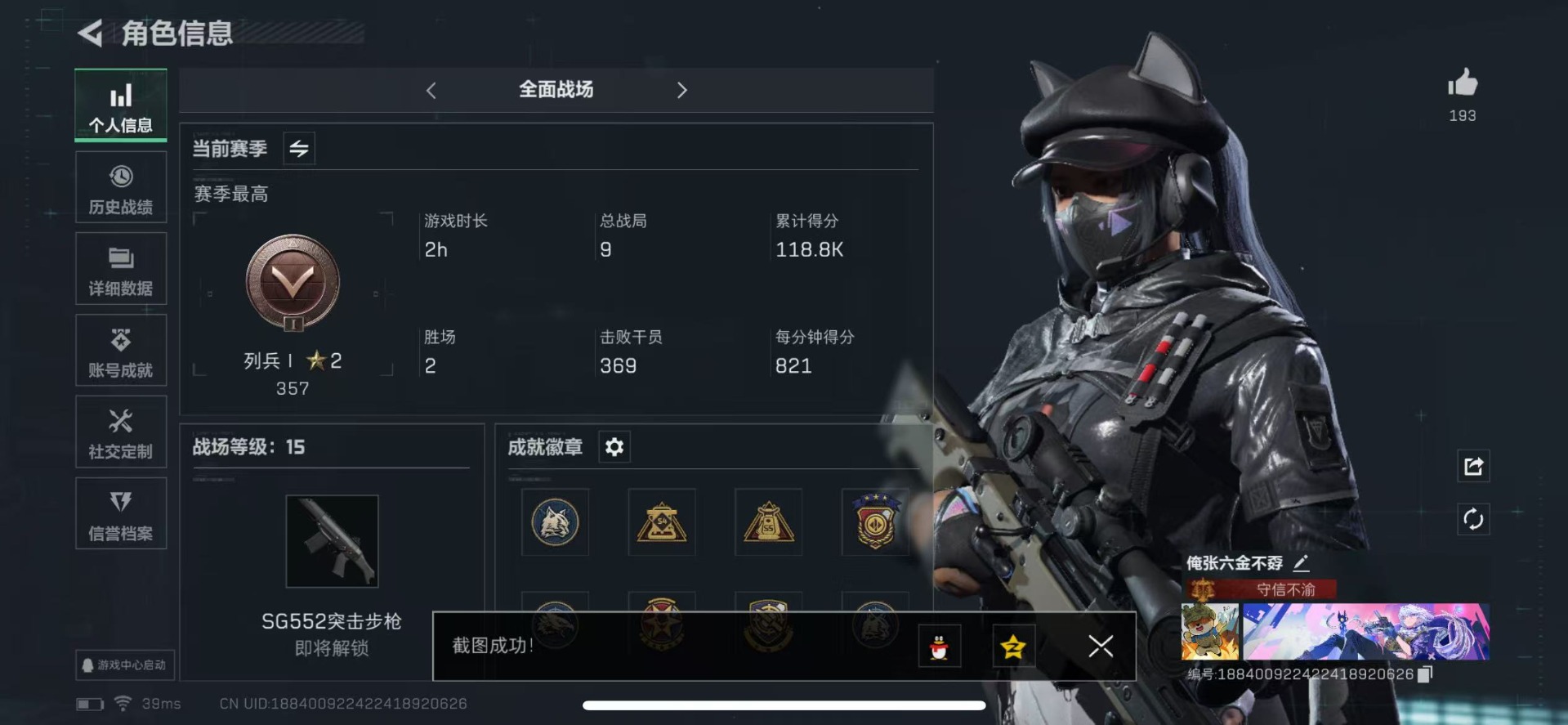 - [12263913]总资产:211.7M 3干员外观 1近战传说 13传说枪械 哈夫币:53.918K 高级安全箱(9.17到期) 可二次 可修改实名 优质装备:近战-北极星 烽火地带段位:黑鹰 全面战场段位:无段位 传说武器皮肤:AWM狙击步枪-捞点薯条,腾龙突击步枪-捞点薯条,93R-捞点薯条,勇士冲锋枪-能天使-午夜邮差,复合弓-黑-天际线,K437突击步枪-北极星,QCQ171冲锋枪-北极星,725双管霰弹枪-送葬人-无题密令,M4A1突击步枪-阿米娅,CAR-15突击步枪-阿米娅,AK-12突击步枪-夜鹰,M4A1突击步枪-蚀金玫瑰 史诗武器皮肤:Ash-12战斗步枪-守夜人,M16A4突击步枪-竞赛选手,PKM通用机枪-守夜人,AS Val突击步枪-尖端治疗,M700狙击步枪-守夜人,SG552突击步枪-尖端治疗,SR-25射手步枪-尖端治疗,M1014霰弹枪-林中猎手,勇士冲锋枪-深海恐惧,AKM突击步枪-林中猎手,SV-98狙击步枪-林中猎手,PTR-32突击步枪-英雄,AS Val突击步枪-典狱官,PKM通用机枪-荒野求生,SCAR-H战斗步枪-囚徒,腾龙突击步枪-无垢,MP7冲锋枪-无垢,PSG-1射手步枪-无垢,SVD狙击步枪-荒野求生,SR-3M紧凑突击步枪-荒野求生,QBZ95-1突击步枪-曙光,Vector冲锋枪-阿萨拉文明,S12K霰弹枪-曙光,M700狙击步枪-竞技风 干员外观:红狼-蚀金玫瑰,蜂医-送葬人·无题密令(S5),露娜-黑·天际线