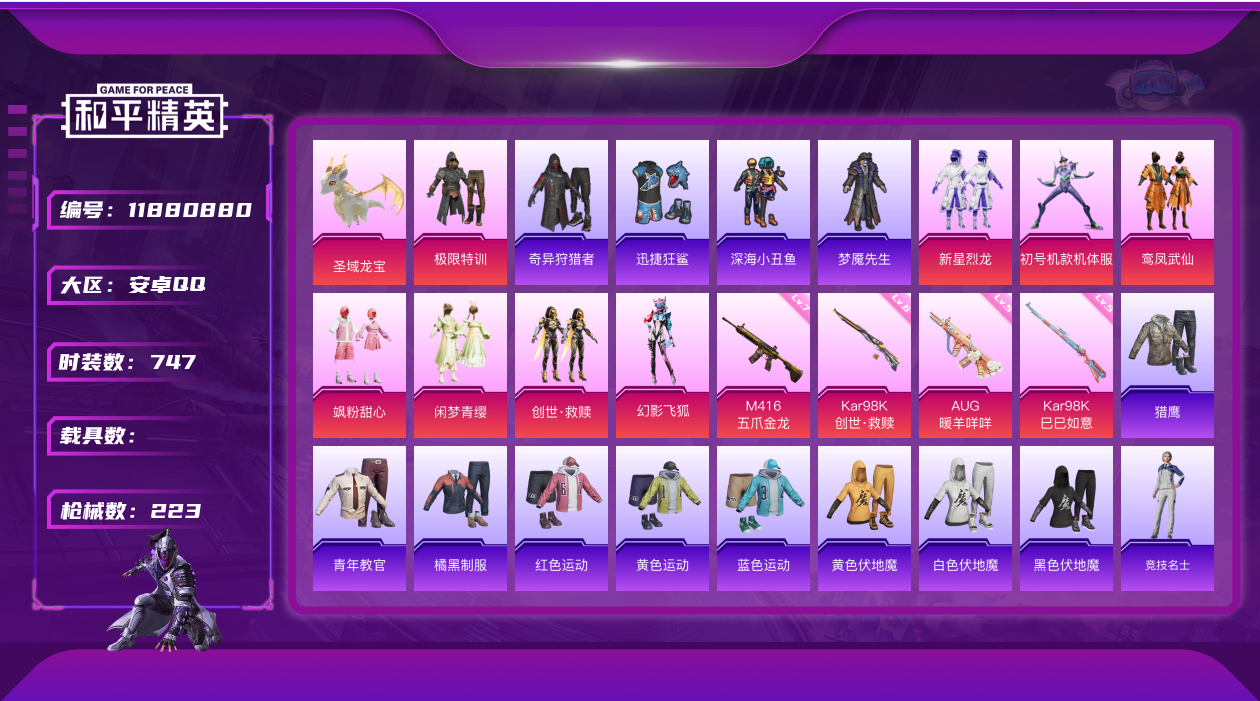 [11880880]8粉装 4特效枪 12印记 可二次 可修改实名 身法装备:暗影哥特(红眼罩),初号机款机体服(紫螳螂) 热门装扮:幻影飞狐,奇异狩猎者,初号机款机体服(紫螳螂),极限特训,新星烈龙(小白龙),鸾凤武仙,飒粉甜心,闲梦青缨,创世·救赎,迅捷狂鲨,梦魇先生,深海小丑鱼 载具:僚机-圣域龙宝 稀有枪皮:AUG-暖羊咩咩,Kar98K-巳巳如意,Kar98K创世·救赎,M416五爪金龙 七级特效枪:七级M416-五爪金龙 六级特效枪:六级Kar98K-创世·救赎 五级特效枪:五级Kar98K-巳巳如意,五级AUG-暖羊咩咩 紫色装扮:照水倚天,和煦暖阳,田园牧歌,轻风白浪,SS22特训,萌趣咩咩,SS20特训,SS21特训,暖心橘喵,娇憨猪猪,幻彩翩翩,人气偶像,军械专家,飞狐塔尔斯,SS30特训套装,妙红点点,灵蜜圈圈,SS23特训,SS31特训套装,青涩时光,特种颜团子,SS15特训,萌趣颜团子,隐空刺,SS13特训,SS14特训,治愈之星,科技之星,飞驰魅影,SS18特训,雪兔飞飞,音速流光,极速竞梦,SS19特训,冰川特警,SS16特训,薰款战斗服,真嗣款战斗服,SS17特训,蓝色运动,虎虎生威吉莉,街头潮人,蓝彩潮人,都市漫游者,都市魅力,酒红色名流,酷潮明星,野性战心,空岛之星,竞技达人朋克,红色运动,绮丽涂鸦,缤纷果语,耀眼新星,荣耀,长空猛禽,冰河战士,龙魂突击队,蝶变,龟仙人,龙腾端午,风暴特警,雪鹰学院,霓虹街区,青年教官,龙的传人,飞行日记,魅力单车,鹤鸣,麻辣教官,黄色伏地魔,黄色名流,黄色运动,黑色伏地魔,福星高照,战地督导,极地朋克,极速红龙,柠萌假日,格斗先锋,橘黑制服,沙漠雄狮,冷焰舞者,吉莉礼服,坚韧舞者,夏日倾情,夏日音浪,完美偶像,帅气教官,幻世战舞者,幻影武者,活力之心,特战英豪,特殊使命,特训学院,狂沙舞者,猎鹰,猛禽,王牌教练,白熊同盟,白色伏地魔,破晓战魂,破蛋小黄鸡,海岛探路者,涂山之恋,深蓝色名流,湖蓝色名流,牛气满满,灼焰舞者,炫蓝之夏,热血青春,燃烧卡路里,牛气冲天,小熊娃娃,雏菊兔兔,萝兰蝴蝶,SS29特训,米开朗基罗,纯真浪花,热情海星,曼妙人鱼,SS28特训,创世·幻影,创世·追猎,燕燕于飞,暗影哥特(红眼罩),鱼渊荷华,玉兔迎春,巳巳如意,烈火街头,森林游猎者,炽纹蛇影,星途旅人,青团波波,糖糖葫芦,棉花软糖,竞