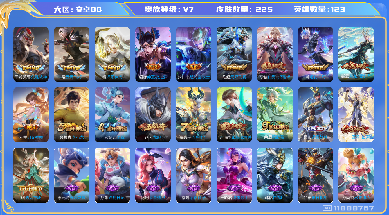 [11888767]【商品标题】:安卓Q-V3-永恒钻石II段位-123英雄-225皮肤-0典藏-0珍品无双-0无双-0珍品传说-12传说-52史诗