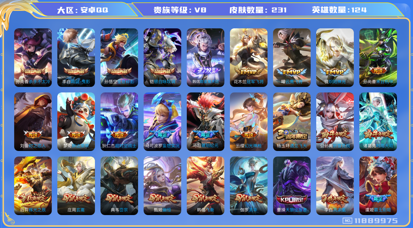 [11889975]【商品标题】:安卓Q-V8-永恒钻石III段位-124英雄-231皮肤-4典藏-0珍品无双-1无双-0珍品传说-18传说-74史诗