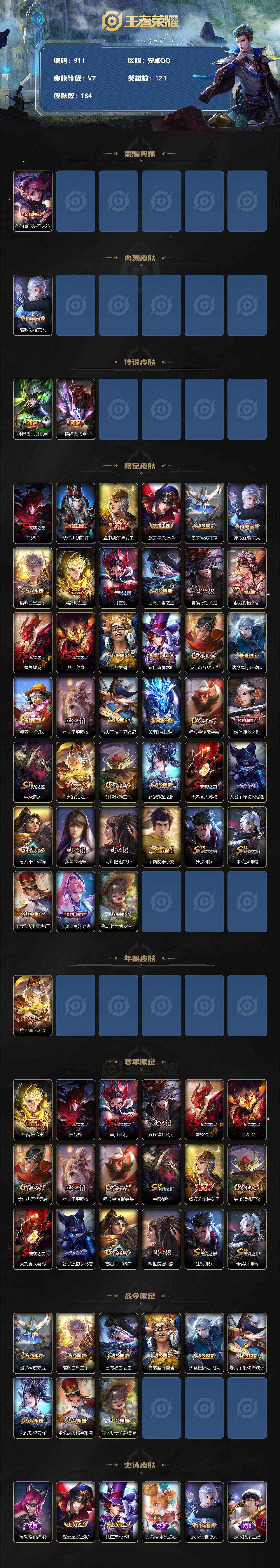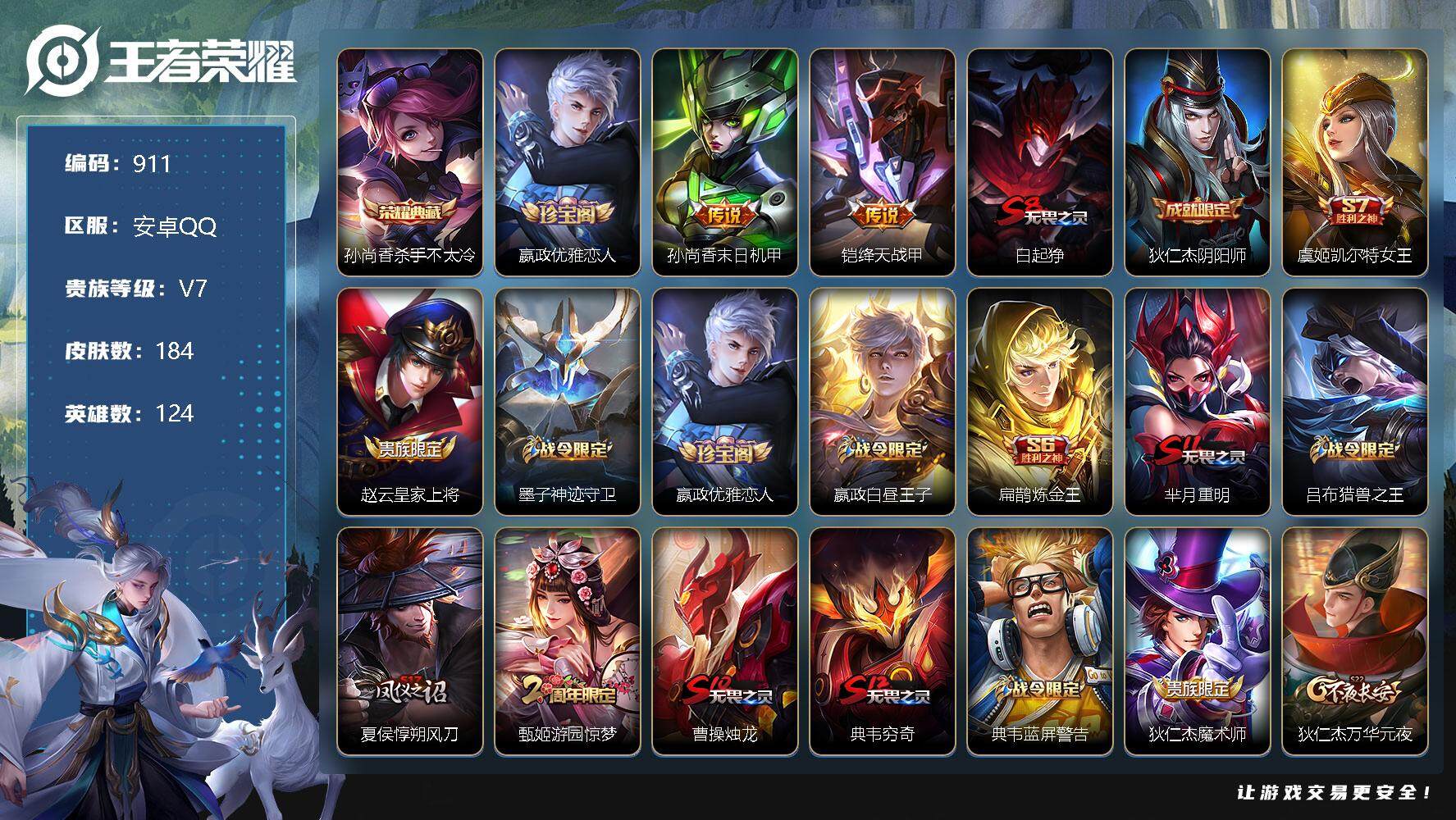 [11890829]【商品标题】:安卓Q-V7-最强王者段位-124英雄-184皮肤-1典藏-0珍品无双-0无双-0珍品传说-2传说-40史诗