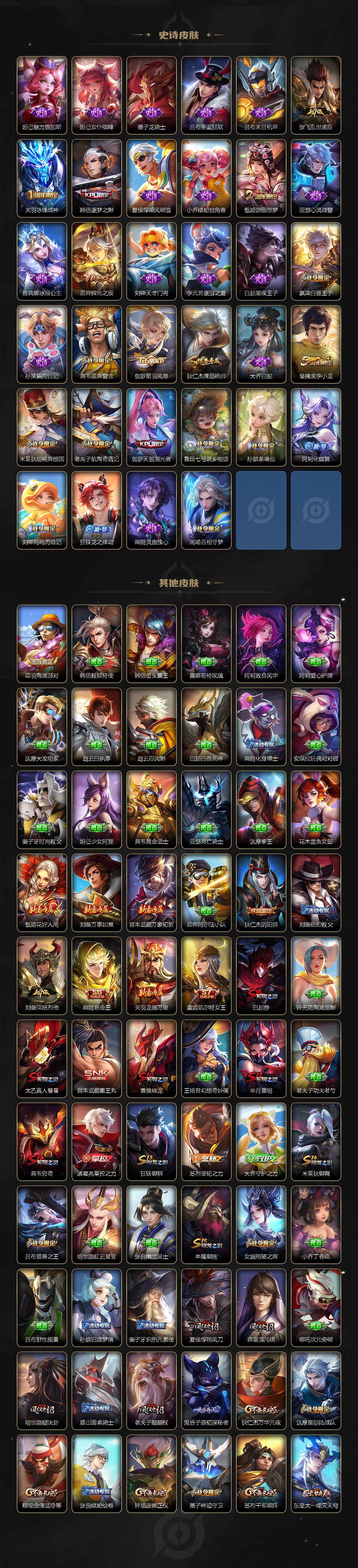 【史诗皮肤】:阿轲暗夜猫娘,赵云皇家上将,狄仁杰魔术师,孙尚香水果甜心,嬴政优雅恋人,嬴政摇滚巨星,妲己魅力维加斯,妲己女仆咖啡,墨子龙骑士,吕布圣诞狂欢,吕布末日机甲,张飞乱世虎臣,关羽冰锋战神,韩信逐梦之影,夏侯惇乘风破浪,小乔缤纷独角兽,甄姬游园惊梦,亚瑟心灵战警,雅典娜冰冠公主,后羿辉光之辰,刘禅天才门将,李元芳逐浪之夏,白起星夜王子,嬴政白昼王子,孙策猫狗日记,典韦蓝屏警告,伽罗箭羽风息,狄仁杰鹰眼统帅,大乔白蛇,裴擒虎李小龙,米莱狄胡桃异想国,老夫子航海奇遇记,伽罗天狼溯光者,鲁班七号蔬乡物语,孙膑茶境仙,阿轲化蝶舞,刘禅鸭鸭历险记,狂铁龙之律动,扁鹊灵蛊蚀心,周瑜百相守梦