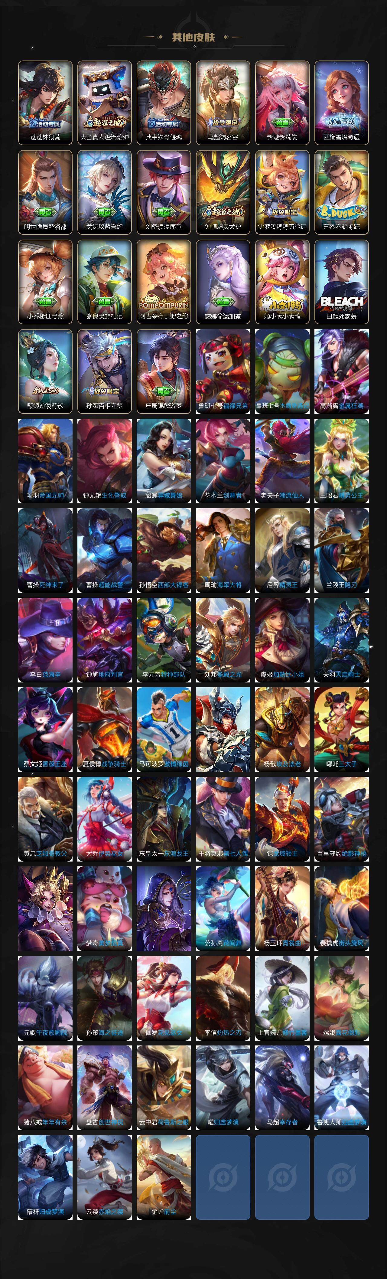【其他皮肤】:项羽海滩派对,韩信教廷特使,韩信街头霸王,露娜哥特玫瑰,阿轲致命风华,阿轲爱心护理,达摩大发明家,赵云白执事,赵云忍炎影,白起白色死神,扁鹊化身博士,安琪拉玩偶对对碰,姜