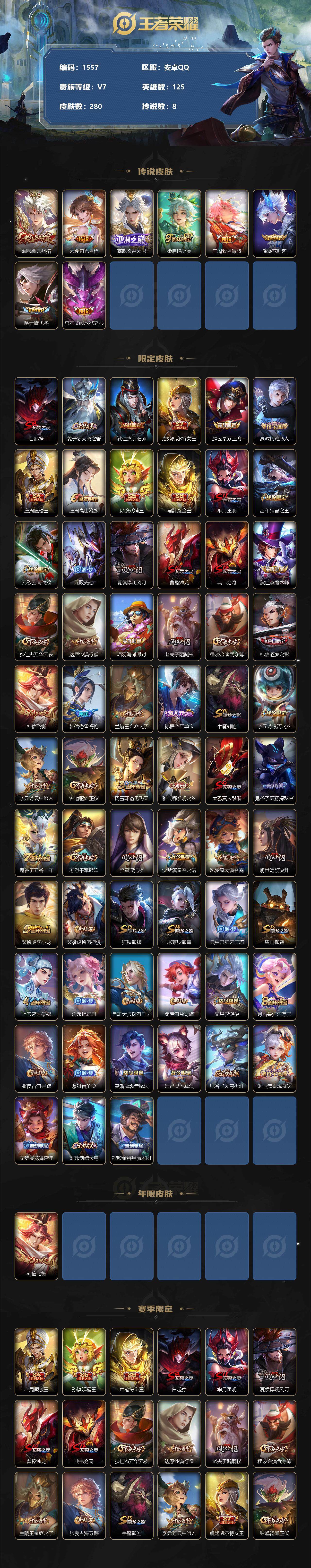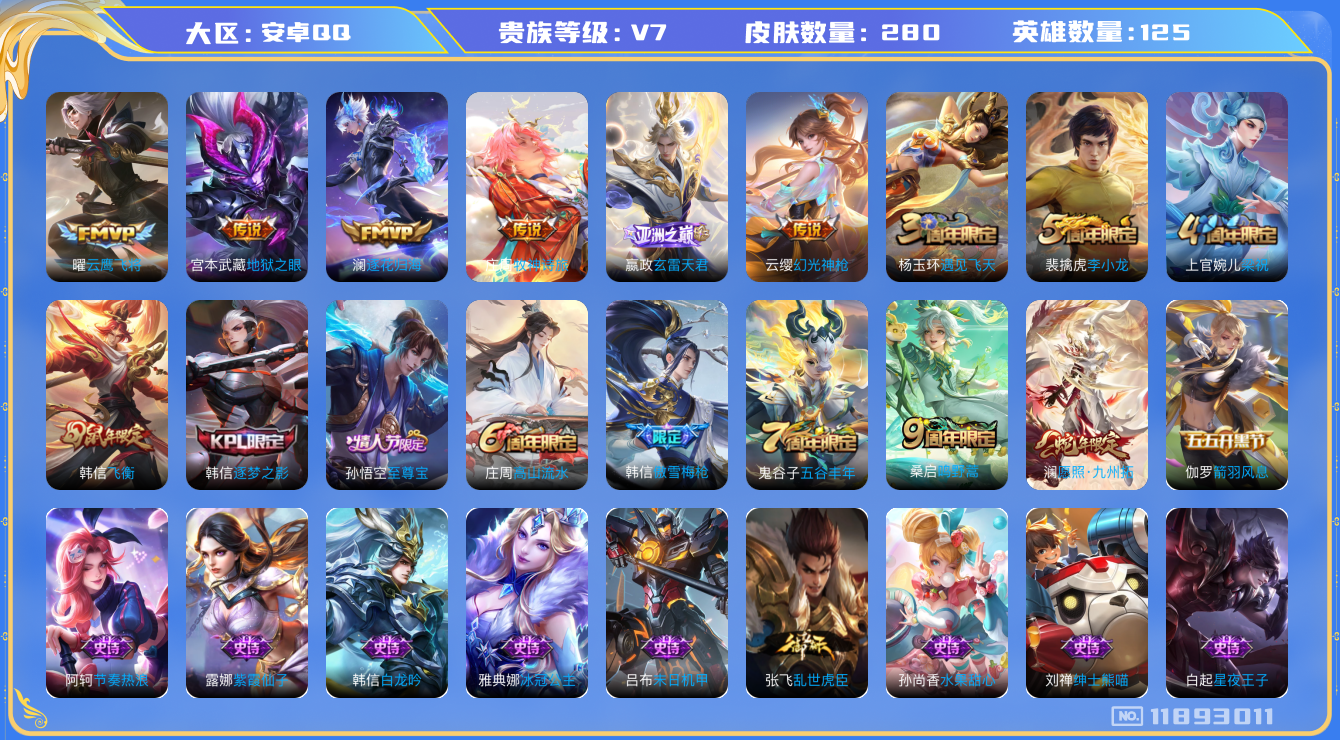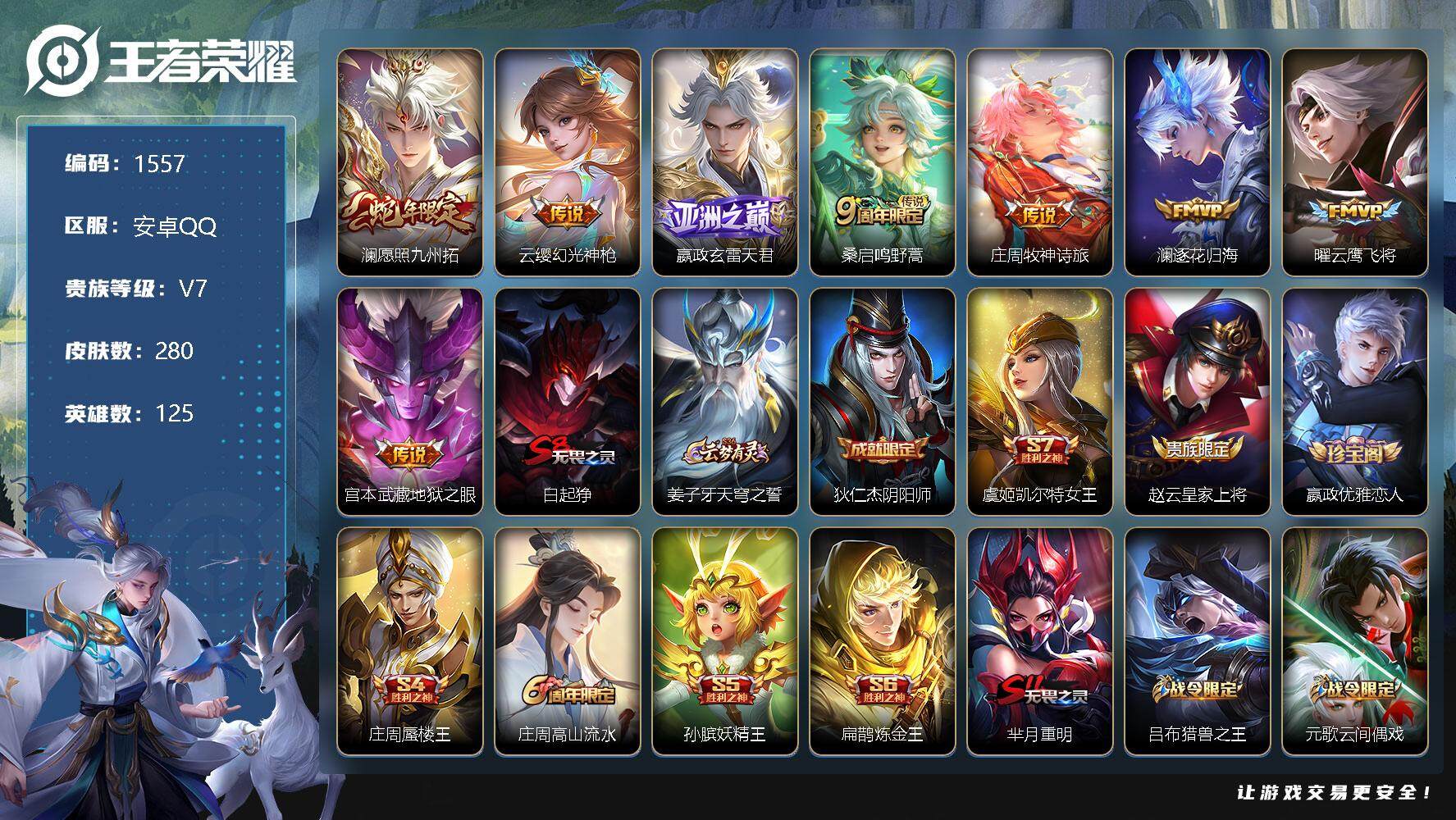[11893011]【商品标题】:安卓Q-V7-最强王者段位-125英雄-280皮肤-0典藏-0珍品无双-0无双-0珍品传说-8传说-65史诗