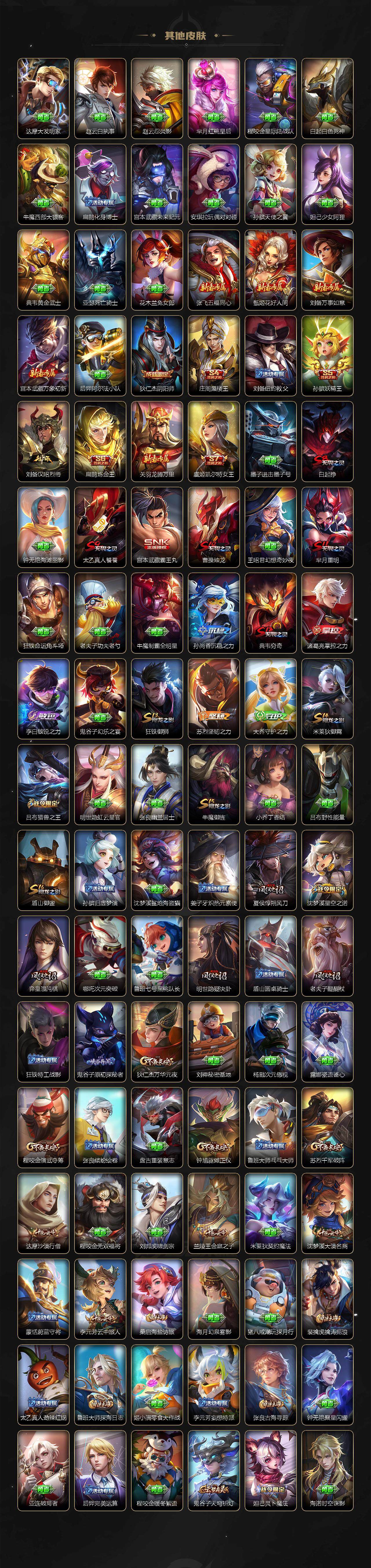庄周蜃楼王,孙膑妖精王,扁鹊炼金王,虞姬凯尔特女王,白起狰,太乙真人饕餮,曹操烛龙,芈月重明,典韦穷奇,狂铁御狮,米莱狄御霄,牛魔御旌,盾山御銮,夏侯惇朔风刀,明世隐疑决卦,老夫子醍醐杖,鬼谷子原初探秘者,狄仁杰万华元夜,程咬金演武夺筹,钟馗驱傩正仪,苏烈千军破阵,吕布猎兽之王,沈梦溪星空之诺,李元芳银河之约,元歌云间偶戏,弈星混沌棋,达摩沙漠行僧,兰陵王金庭之子,沈梦溪大漠名商,李元芳云中旅人,桑启海盐诗旅,裴擒虎擒涛扼浪,鲁班大师探海日志,张良古海寻踪