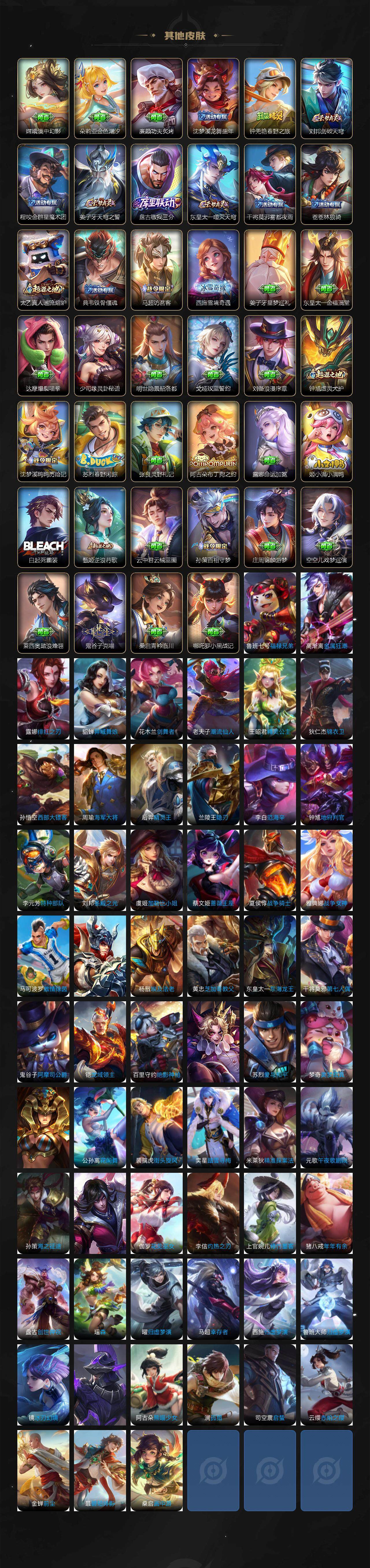 【限定皮肤】:白起狰,姜子牙天穹之誓,狄仁杰阴阳师,虞姬凯尔特女王,赵云皇家上将,嬴政优雅恋人,庄周蜃楼王,庄周高山流水,孙膑妖精王,扁鹊炼金王,芈月重明,吕布猎兽之王,元歌云间偶戏,元歌无心,夏侯惇朔风刀,曹操烛龙,典韦穷奇,狄仁杰魔术师,狄仁杰万华元夜,达摩沙漠行僧,项羽海滩派对,老夫子醍醐杖,程咬金演武夺筹,韩信逐梦之影,韩信飞衡,韩信傲雪梅枪,兰陵王金庭之子,孙悟空至尊宝,牛魔御旌,李元芳银河之约,李元芳云中旅人,钟馗驱傩正仪,杨玉环遇见飞天,雅典娜黎明之约,太乙真人饕餮,鬼谷子原初探秘者,鬼谷子五谷丰年,苏烈千军破阵,弈星混沌棋,沈梦溪星空之诺,沈梦溪大漠名商,明世隐疑决卦,裴擒虎李小龙,裴擒虎擒涛扼浪,狂铁御狮,米莱狄御霄,云中君纤云弄巧,盾山御銮,上官婉儿梁祝,嫦娥拒霜思,鲁班大师探海日志,桑启海盐诗旅,暃星界游侠,阿古朵江河有灵,张良古海寻踪,蒙犽百解令,高渐离燃音魔法,妲己灵卜魔法,鬼谷子天穹祈灯,姬小满妄想食味,沈梦溪龙舞盛年,刘邦剑破天穹,程咬金群星魔术团