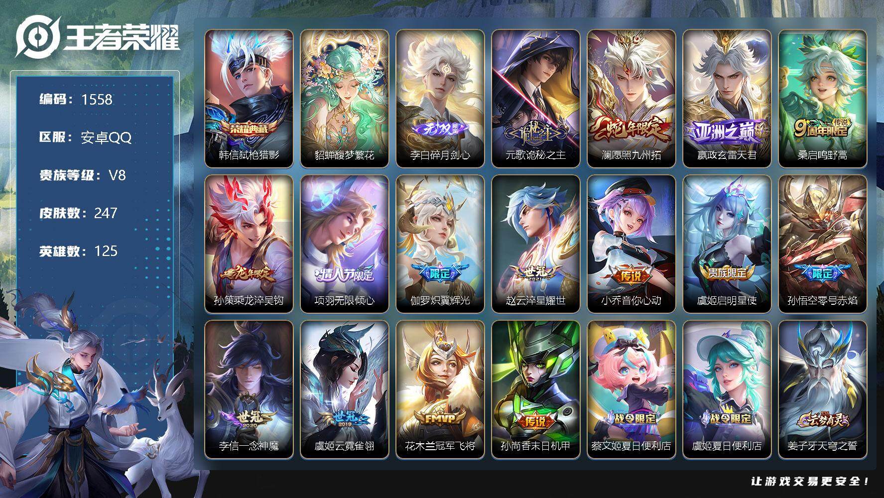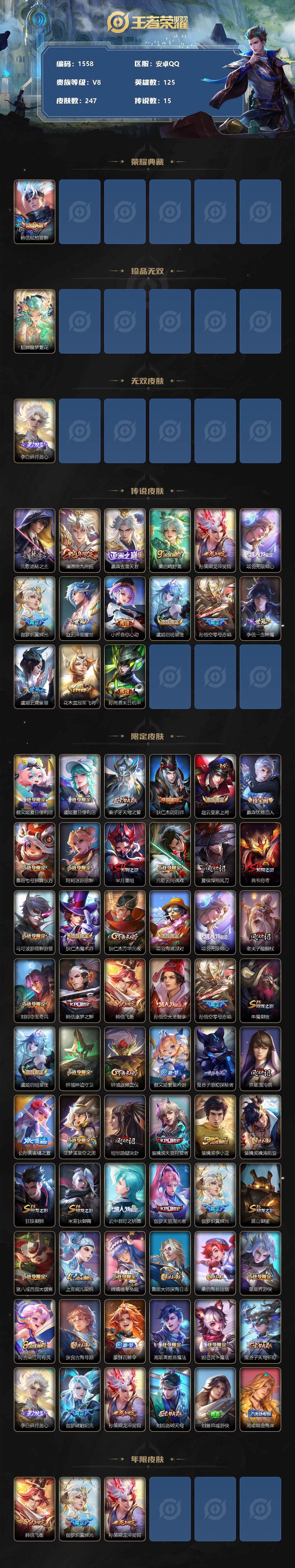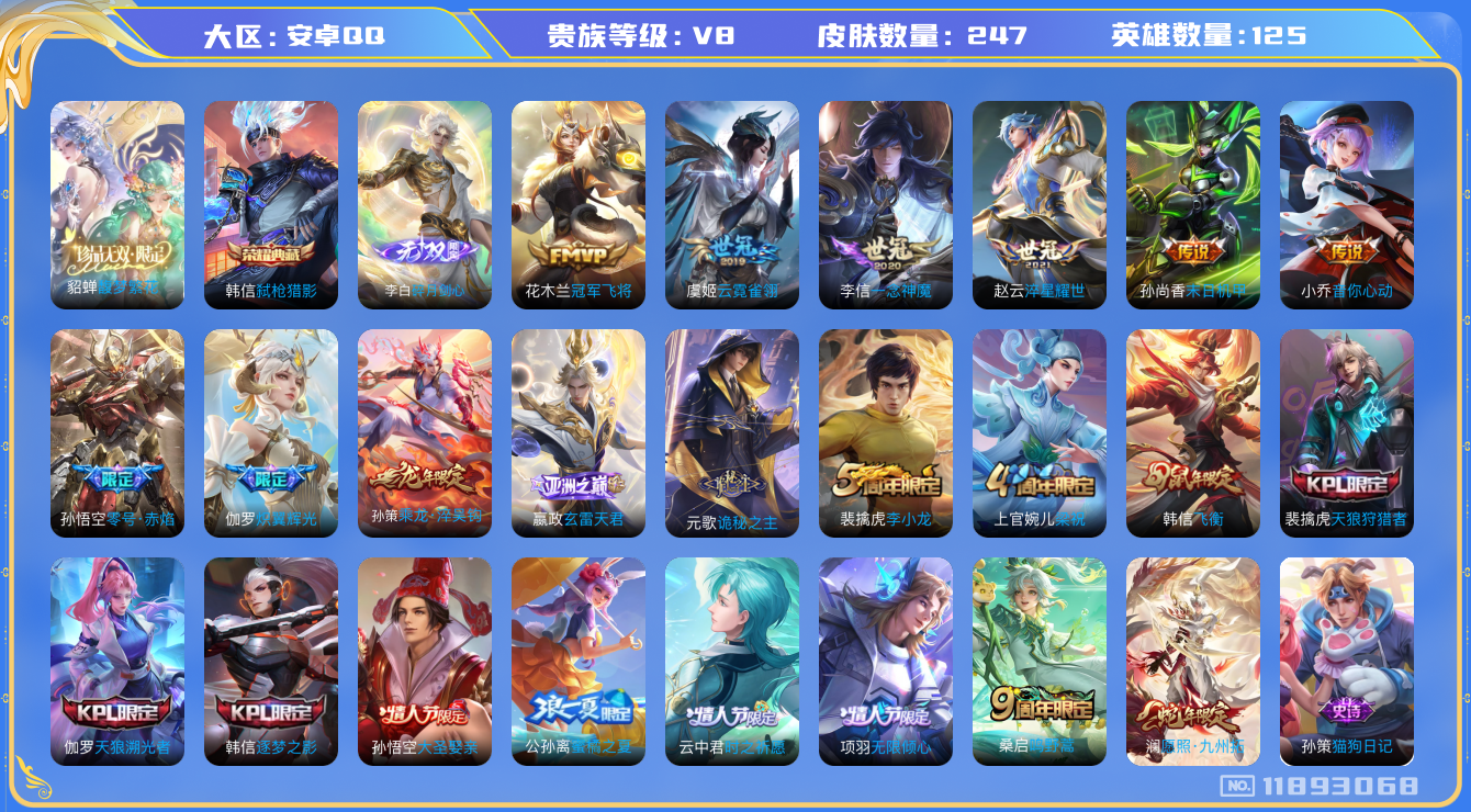 [11893068]【商品标题】:安卓Q-V8-最强王者段位-125英雄-247皮肤-1典藏-1珍品无双-1无双-0珍品传说-15传说-59史诗