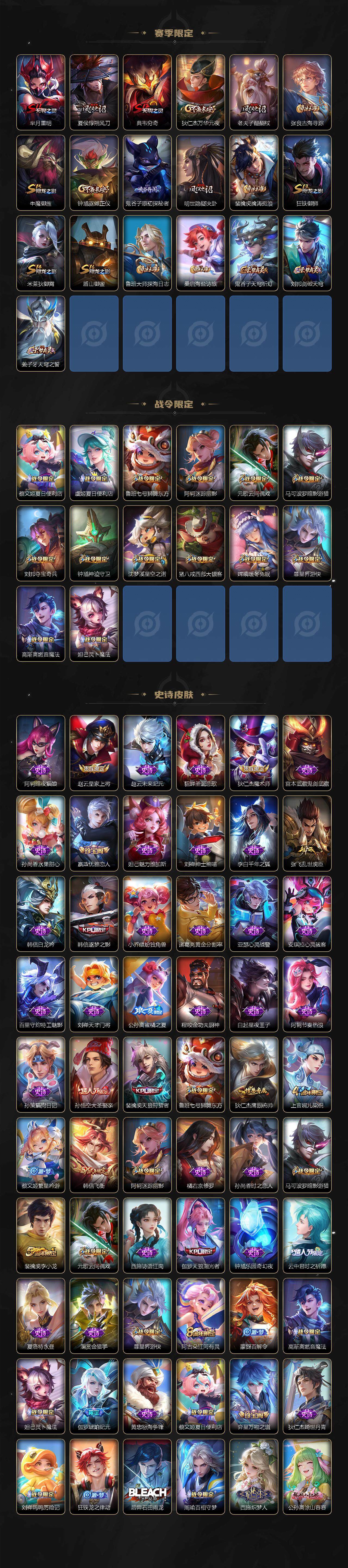 【赛季限定】:芈月重明,夏侯惇朔风刀,典韦穷奇,狄仁杰万华元夜,老夫子醍醐杖,张良古海寻踪,牛魔御旌,钟馗驱傩正仪,鬼谷子原初探秘者,弈星混沌棋,明世隐疑决卦,裴擒虎擒涛扼浪,狂铁御狮,米莱狄御霄,盾山御銮,鲁班大师探海日志,桑启海盐诗旅,鬼谷子天穹祈灯,刘邦剑破天穹,姜子牙天穹之誓