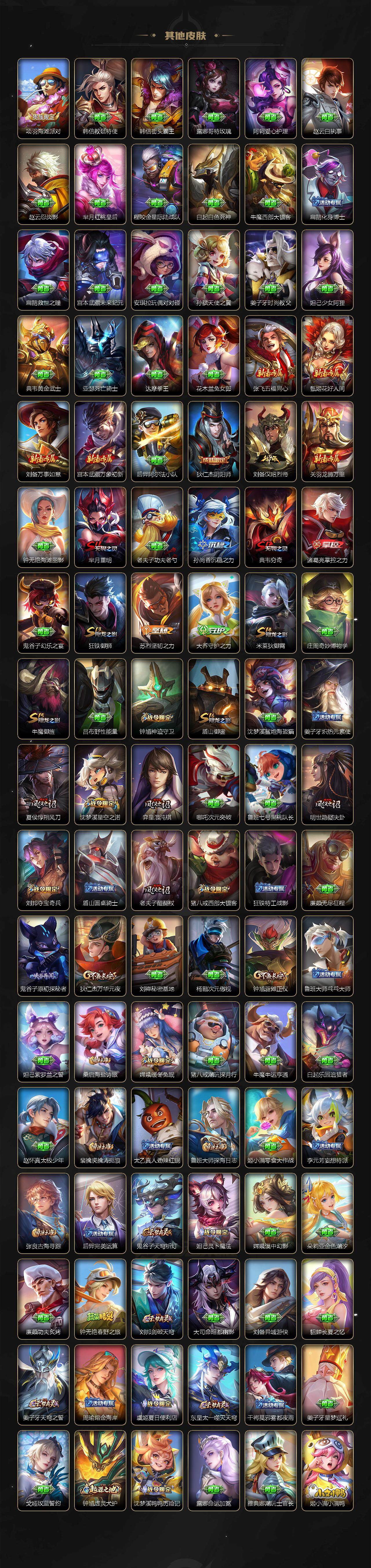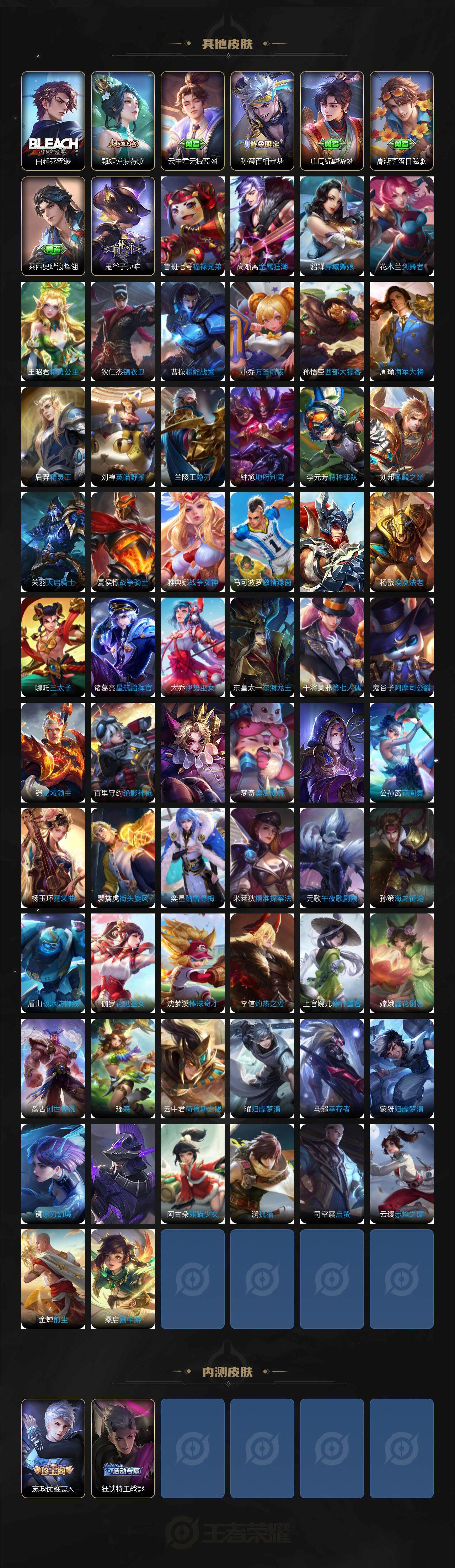 【限定皮肤】:蔡文姬夏日便利店,虞姬夏日便利店,姜子牙天穹之誓,狄仁杰阴阳师,赵云皇家上将,嬴政优雅恋人,鲁班七号狮舞东方,阿轲迷踪丽影,芈月重明,元歌云间偶戏,夏侯惇朔风刀,典韦穷奇,马可波罗暗影游猎,狄仁杰魔术师,狄仁杰万华元夜,项羽海滩派对,项羽无限倾心,老夫子醍醐杖,刘邦夺宝奇兵,韩信逐梦之影,韩信飞衡,孙悟空大圣娶亲,孙悟空零号赤焰,牛魔御旌,虞姬启明星使,钟馗神迹守卫,钟馗驱傩正仪,蔡文姬繁星吟游,鬼谷子原初探秘者,弈星混沌棋,公孙离蜜橘之夏,沈梦溪星空之诺,明世隐疑决卦,裴擒虎天狼狩猎者,裴擒虎李小龙,裴擒虎擒涛扼浪,狂铁御狮,米莱狄御霄,云中君时之祈愿,伽罗天狼溯光者,伽罗炽翼辉光,盾山御銮,猪八戒西部大镖客,上官婉儿梁祝,嫦娥暖冬兔眠,鲁班大师探海日志,桑启海盐诗旅,暃星界游侠,阿古朵江河有灵,张良古海寻踪,蒙犽百解令,高渐离燃音魔法,妲己灵卜魔法,鬼谷子天穹祈灯,李白碎月剑心,伽罗琥珀纪元,孙策乘龙淬吴钩,刘邦剑破天穹,刘备异域游侠,周瑜熔金海岸