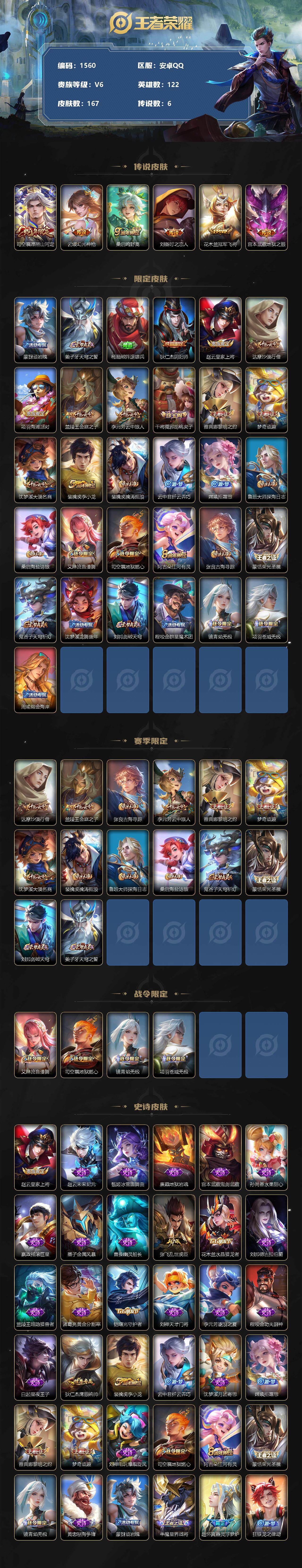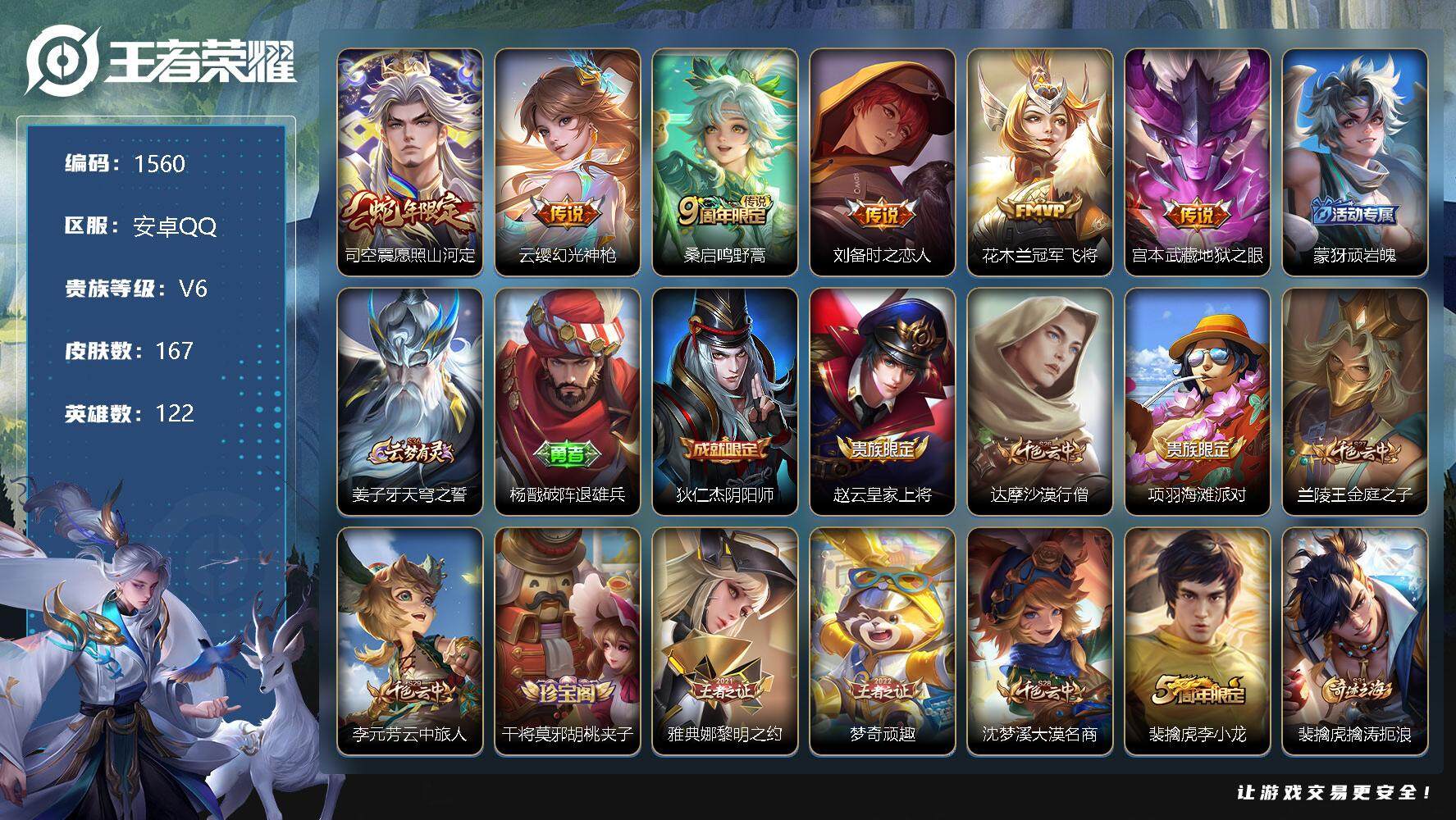 [11893174]【商品标题】:安卓Q-V1-最强王者段位-122英雄-167皮肤-0典藏-0珍品无双-0无双-0珍品传说-6传说-36史诗