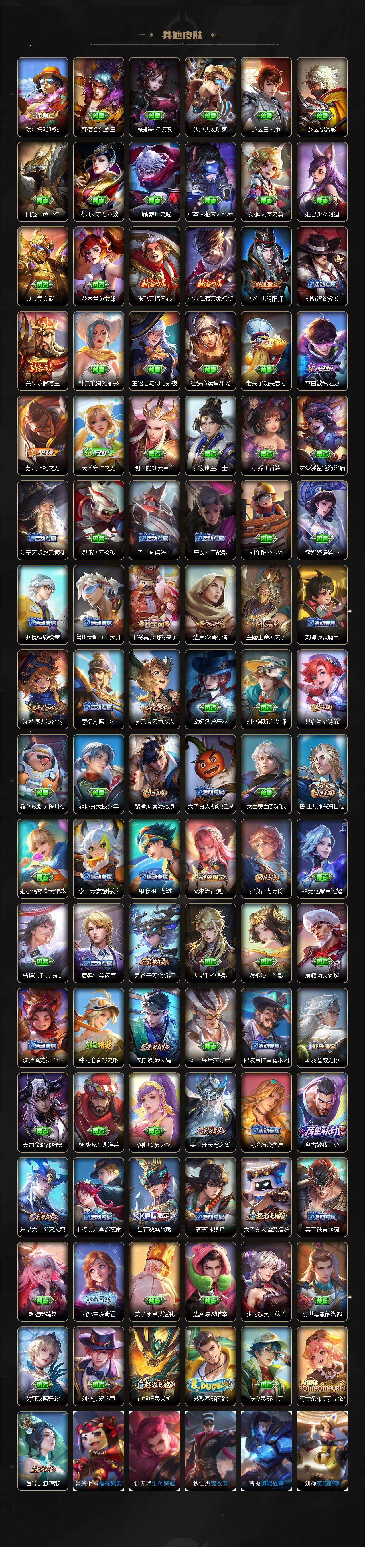 【其他皮肤】:项羽海滩派对,韩信街头霸王,露娜哥特玫瑰,达摩大发明家,赵云白执事,赵云忍炎影,白起白色死神,武则天东方不败,扁鹊救世之瞳,宫本武藏未来纪元,孙膑天使之翼,妲己少女阿狸,典韦黄金武士,花木兰兔女郎,张飞五福同心,宫本武藏万象初新,狄仁杰阴阳师,刘备纽约教父,关羽龙腾万里,钟无艳海滩丽影,王昭君幻想奇妙夜,狂铁命运角斗场,老夫子功夫老勺,李白敏锐之力,苏烈坚韧之力,大乔守护之力,明世隐虹云星官,张良幽兰居士,小乔丁香结,沈梦溪鲨炮