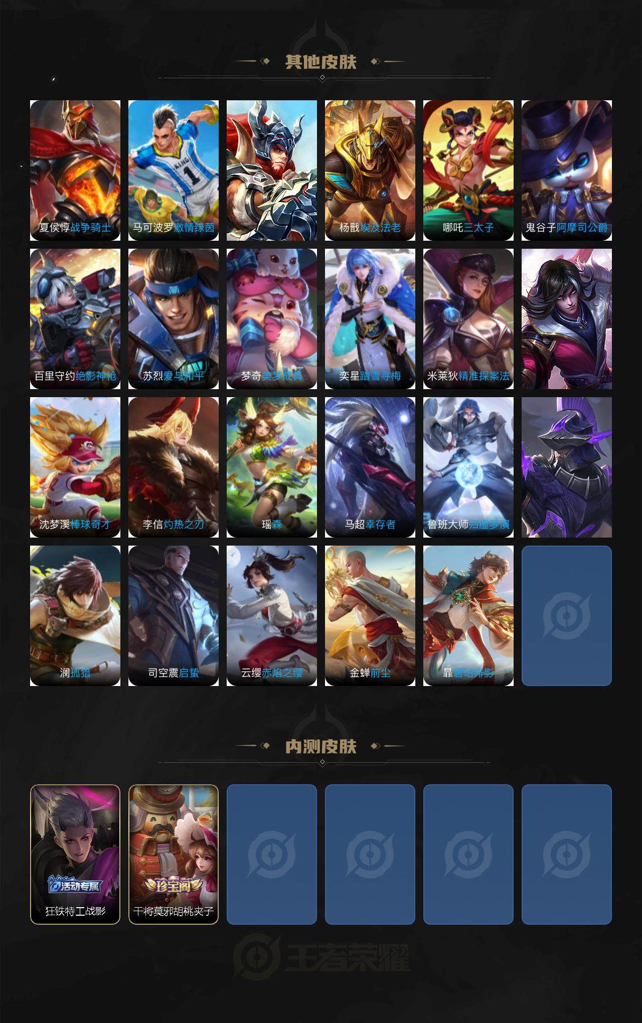 【限定皮肤】:蒙犽顽岩魄,姜子牙天穹之誓,杨戬破阵退雄兵,狄仁杰阴阳师,赵云皇家上将,达摩沙漠行僧,项羽海滩派对,兰陵王金庭之子,李元芳云中旅人,干将莫邪胡桃夹子,雅典娜黎明之约,梦奇顽趣,沈梦溪大漠名商,裴擒虎李小龙,裴擒虎擒涛扼浪,云中君纤云弄巧,嫦娥拒霜思,鲁班大师探海日志,桑启海盐诗旅,艾琳流音漫舞,司空震地狱燃心,阿古朵江河有灵,张良古海寻踪,蒙恬荣光圣徽,鬼谷子天穹祈灯,沈梦溪龙舞盛年,刘邦剑破天穹,程咬金群星魔术团,镜青焰无极,项羽苍威无极,周瑜熔金海岸