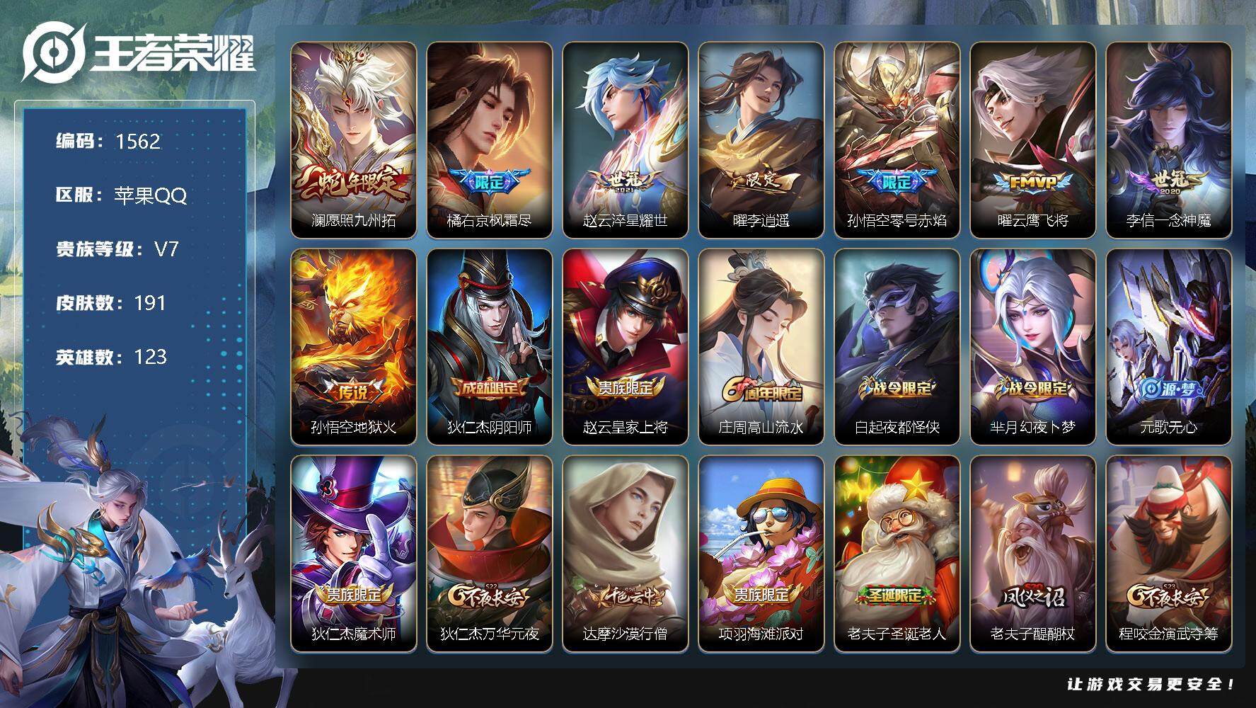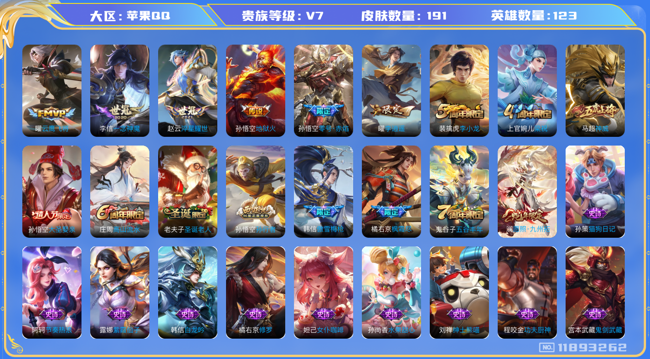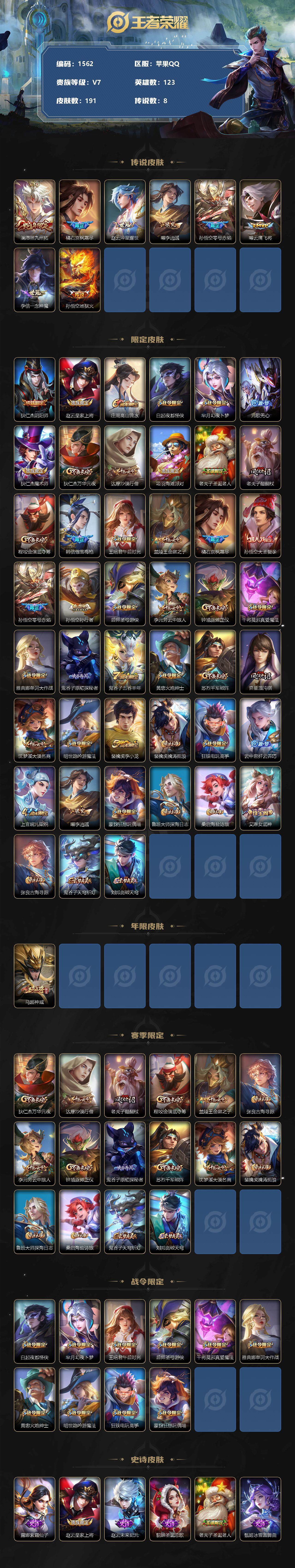 [11893262]【商品标题】:苹果Q-V0-最强王者段位-123英雄-191皮肤-0典藏-0珍品无双-0无双-0珍品传说-8传说-41史诗