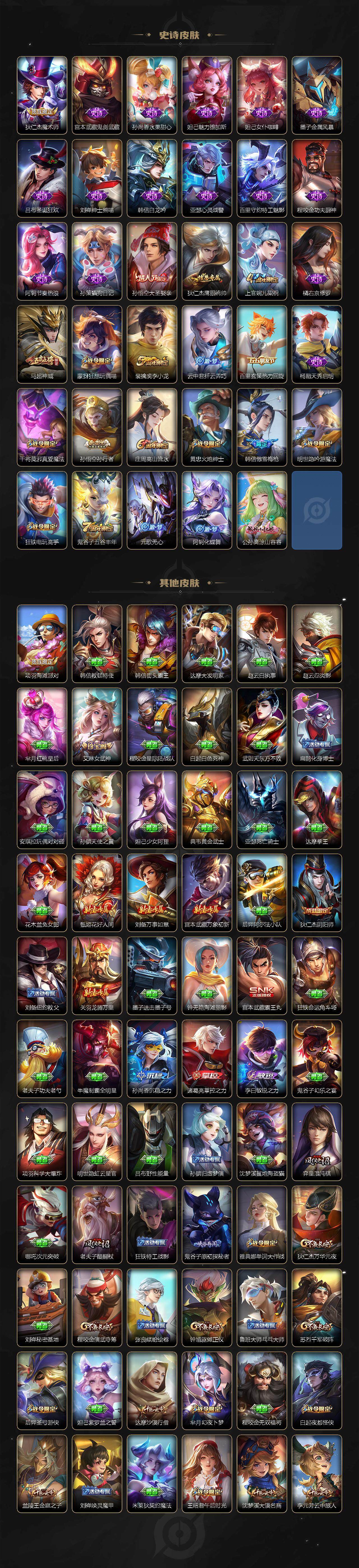 【限定皮肤】:狄仁杰阴阳师,赵云皇家上将,庄周高山流水,白起夜都怪侠,芈月幻夜卜梦,元歌无心,狄仁杰魔术师,狄仁杰万华元夜,达摩沙漠行僧,项羽海滩派对,老夫子圣诞老人,老夫子醍醐杖,程咬金演武夺筹,韩信傲雪梅枪,王昭君午后时光,兰陵王金庭之子,橘右京枫霜尽,孙悟空大圣娶亲,孙悟空零号赤焰,孙悟空孙行者,后羿圣弓游侠,李元芳云中旅人,钟馗驱傩正仪,干将莫邪真爱魔法,雅典娜单词大作战,鬼谷子原初探秘者,鬼谷子五谷丰年,黄忠火炮绅士,苏烈千军破阵,弈星混沌棋,沈梦溪大漠名商,明世隐吟游魔法,裴擒虎李小龙,裴擒虎擒涛扼浪,狂铁电玩高手,云中君纤云弄巧,上官婉儿梁祝,曜李逍遥 ,蒙犽狂想玩偶喵,鲁班大师探海日志,桑启海盐诗旅,艾琳女武神,张良古海寻踪,鬼谷子天穹祈灯,刘邦剑破天穹