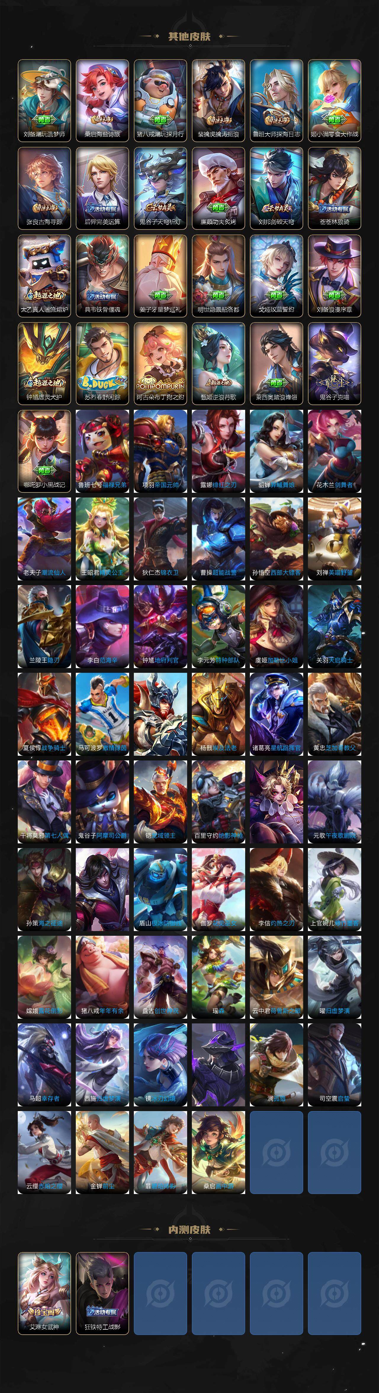 【赛季限定】:狄仁杰万华元夜,达摩沙漠行僧,老夫子醍醐杖,程咬金演武夺筹,兰陵王金庭之子,张良古海寻踪,李元芳云中旅人,钟馗驱傩正仪,鬼谷子原初探秘者,苏烈千军破阵,弈星混沌棋,沈梦溪大漠名商,裴擒虎擒涛扼浪,鲁班大师探海日志,桑启海盐诗旅,鬼谷子天穹祈灯,刘邦剑破天穹