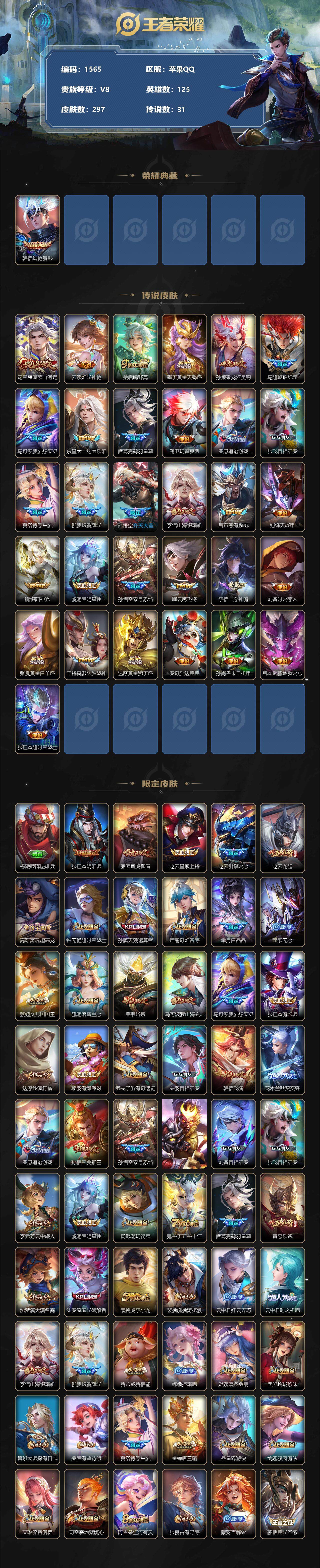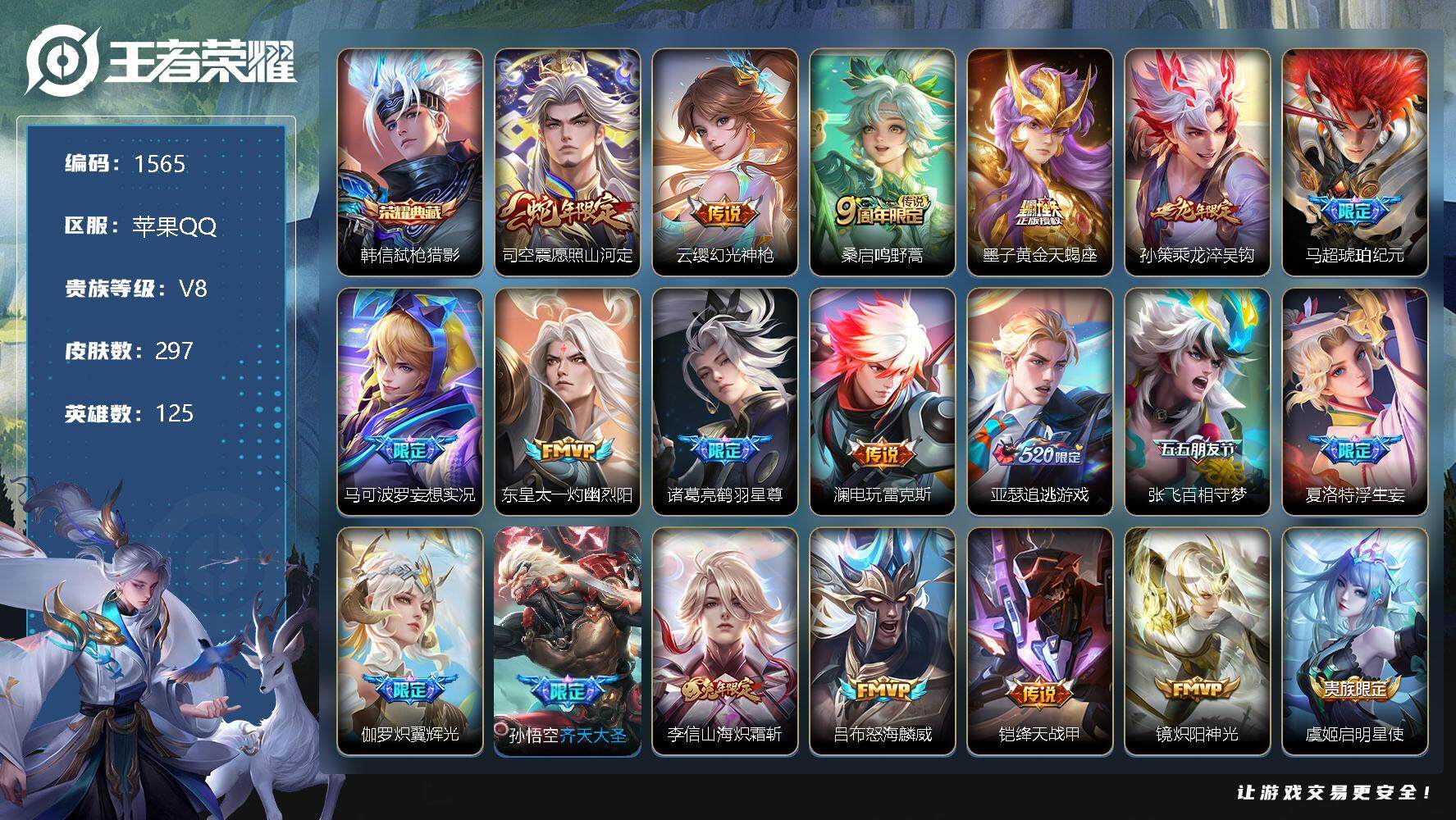 [11893390]【商品标题】:苹果Q-V8-最强王者段位-125英雄-297皮肤-1典藏-0珍品无双-0无双-0珍品传说-31传说-86史诗