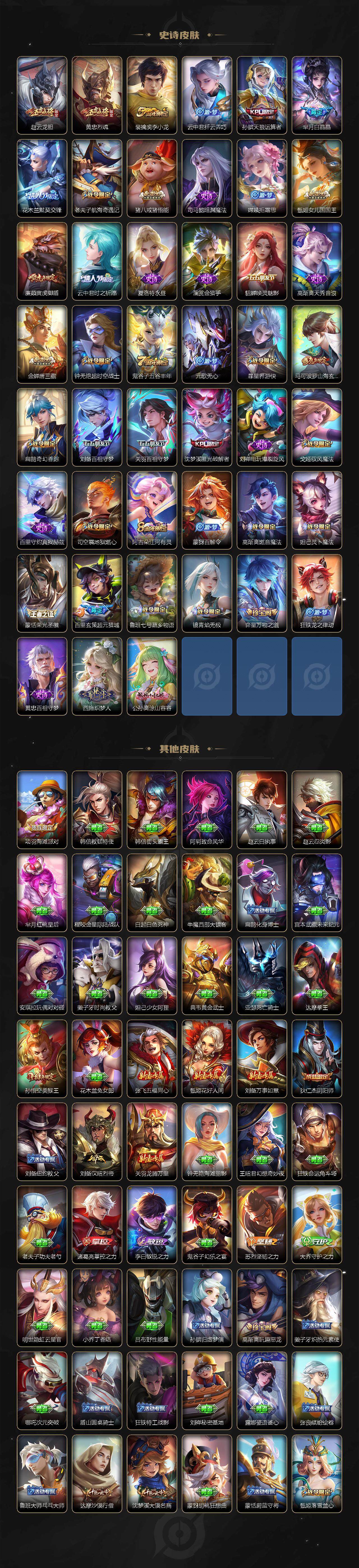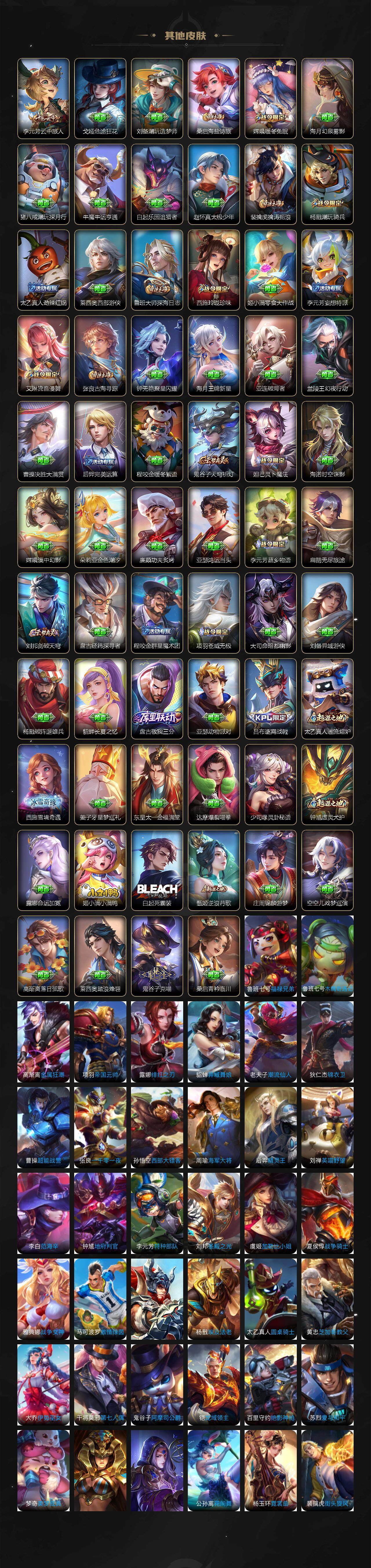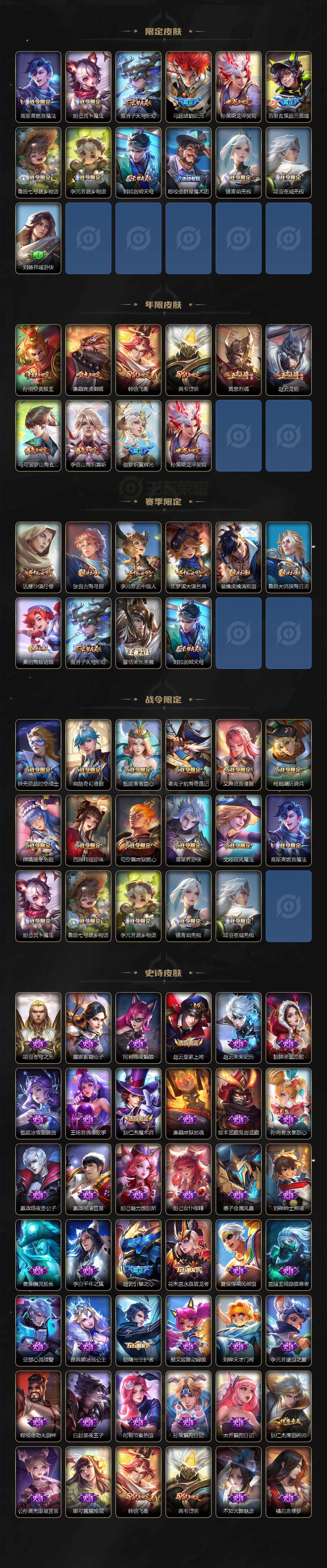 【限定皮肤】:杨戬破阵退雄兵,狄仁杰阴阳师,廉颇寅虎御盾,赵云皇家上将,赵云引擎之心,赵云龙胆,高渐离玩趣恶龙,钟无艳超时空战士,孙膑天狼运算者,扁鹊奇幻香踪,芈月白晶晶,元歌无心,甄姬女儿国国王,甄姬落雪兰心,典韦岱宗,马可波罗山海玄木吟,马可波罗妄想实况,狄仁杰魔术师,达摩沙漠行僧,项羽海滩派对,老夫子航海奇遇记,关羽百相守梦,韩信飞衡,花木兰默契交锋,亚瑟追逃游戏,孙悟空美猴王,孙悟空零号赤焰,孙悟空齐天大圣,刘备百相守梦,张飞百相守梦,李元芳云中旅人,虞姬启明星使,杨戬潮玩骑兵,鬼谷子五谷丰年,诸葛亮鹤羽星尊,黄忠烈魂,沈梦溪大漠名商,沈梦溪匿光破解者,裴擒虎李小龙,裴擒虎擒涛扼浪,云中君纤云弄巧,云中君时之祈愿,李信山海炽霜斩,伽罗炽翼辉光,猪八戒猪悟能,嫦娥拒霜思,嫦娥暖冬兔眠,西施玲珑珍味,鲁班大师探海日志,桑启海盐诗旅,夏洛特浮生妄,金蝉唐三藏,暃星界游侠,戈娅驭风魔法,艾琳流音漫舞,司空震地狱燃心,阿古朵江河有灵,张良古海寻踪,蒙犽百解令,蒙恬荣光圣徽,高渐离燃音魔法,妲己灵卜魔法,鬼谷子天穹祈灯,马超琥珀纪元,孙策乘龙淬吴钩,百里玄策超元猎域,鲁班七号蔬乡物语,李元芳蔬乡物语,刘邦剑破天穹,程咬金群星魔术团,镜青焰无极,项羽苍威无极,刘备异域游侠