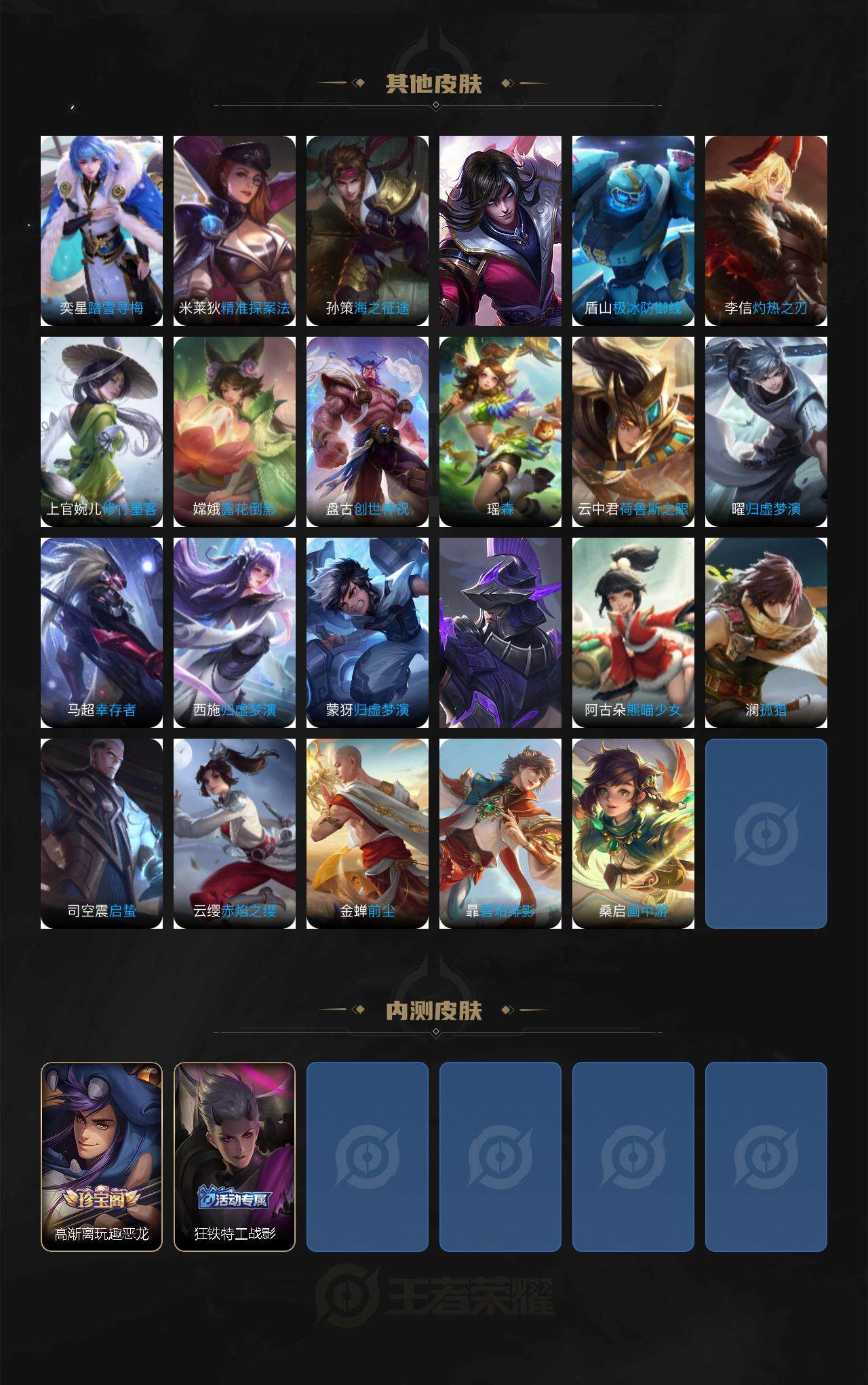 【年限皮肤】:孙悟空美猴王,廉颇寅虎御盾,韩信飞衡,典韦岱宗,黄忠烈魂,赵云龙胆,马可波罗山海玄木吟,李信山海炽霜斩,伽罗炽翼辉光,孙策乘龙淬吴钩