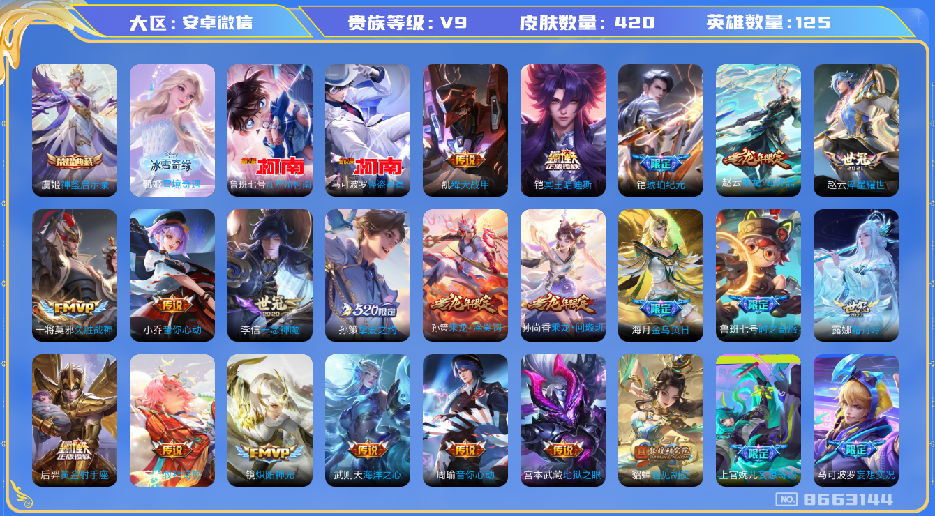[8663144]V9 1典藏 1无双 2珍品传说 44传说 125英雄 420皮肤 典藏英雄武则天 安全保护中 可修改实名 荣耀水晶:神鉴启示录 无双皮:雪境奇遇-甄姬 珍品传说:江户川柯南,怪盗基德 传说皮:牧神诗旅,金乌负日,琥珀纪元铠,琥珀纪元马超,乘龙·问璇玑(孙尚香年限),乘龙·铭钟鼎(赵云年限),乘龙·淬吴钩(孙策年限),黄金天蝎座,云中君群星魔术团,玄雷天君,铠冥王哈迪斯,李逍遥,遇见胡旋,游龙清影(小青龙),黄金射手座,零号·赤焰,海洋之心,地狱之眼,一念神魔,淬星耀世,久胜战神,炽阳神光,音你心动-小乔,音你心动-周瑜,胖达荣荣,飞鸢探春,绛天战甲(鸡嘴战神),超时空战士-狄仁杰,挚爱之约,妄想实况,妄想奇谈,鲁班七号-时之奇旅,夜礼服假面,霜月吟,澜逐花归海 珍宝阁皮:妄想食味,优雅恋人,女武神 限定皮:逐霄战戟,映山客,陌上桑,鸣野蒿,夏侯惇霜北刀,至尊宝,凤求凰(白切鸡),凤凰于飞,异界灵契(白毛香),时之彼端,白鹤梁神女,魔法小厨娘,白晶晶,时雨天司(水龙头),至美·乘鲤谣,遇见飞天,高山流水,五谷丰年,梁祝,御风骁将(吕布年限),岱宗(典韦年限),天狼溯光者,奔雷神使(牛魔年限),祈雪灵祝(雪兔子),李小龙,逐梦之影,霸王别姬-虞姬,默契交锋-兰陵王,默契交锋-花木兰,孙行者,大圣娶亲,乒乒小将,女儿国国王,唐三藏,山海·玄木吟(马可年限) 史诗皮:星界特工,谪仙醉月,百相守梦-百里守约,星界战将,茶境仙,芈月浮光幕影,炽弈燎原,破空之剑,海诺心动手记,决胜骁骑,上官婉儿群星魔术团,奇遇星旅,蔬乡物语(鲁班七号),战舞者,乘龙·聚宝船(安琪拉年限),乘龙·忆丹青(大乔年限),琥珀纪元伽罗,埋骨钱,蒙犽顽岩魄,东方月初,怒海争锋,紫霞仙子,苍穹之光,电玩小子(小书包),黄金分割率,特工魅影,千年之狐,永昼,电玩·爆裂旋风,暗夜猫娘,浮梦罗烟,龙骑士(小龙虾),百相守梦(刘备),冰冠公主,魅语,无限星赏官,晚萤,偶像歌手,蒙恬荣光圣徽,高渐离燃音魔法,百解令(蒙犽),雪夜绮愿(周瑜),江河有灵,匿光侦查者,末日机甲-吕布,猫狗日记-孙策,猫狗日记-大乔,乱世虎臣,节奏热浪,修罗,女仆咖啡,摇滚巨星,水果甜心,绅士熊喵,天才门将,星夜王子,心灵骇客,时之奇旅-安琪拉,功夫厨神,德古拉伯爵,暗隐猎兽者,幽灵船长,鬼剑武藏,暗渊魔法,心灵战警,乐园奇幻夜,