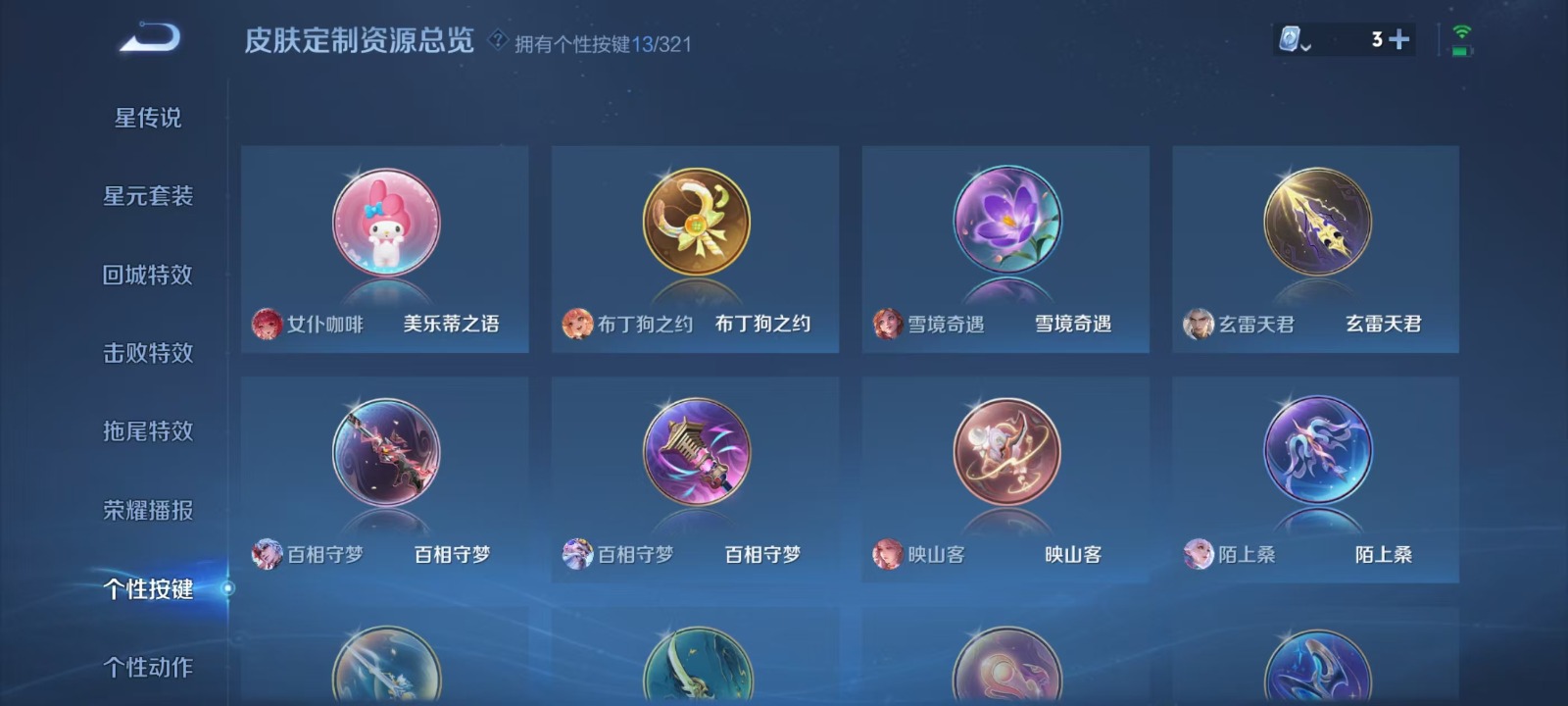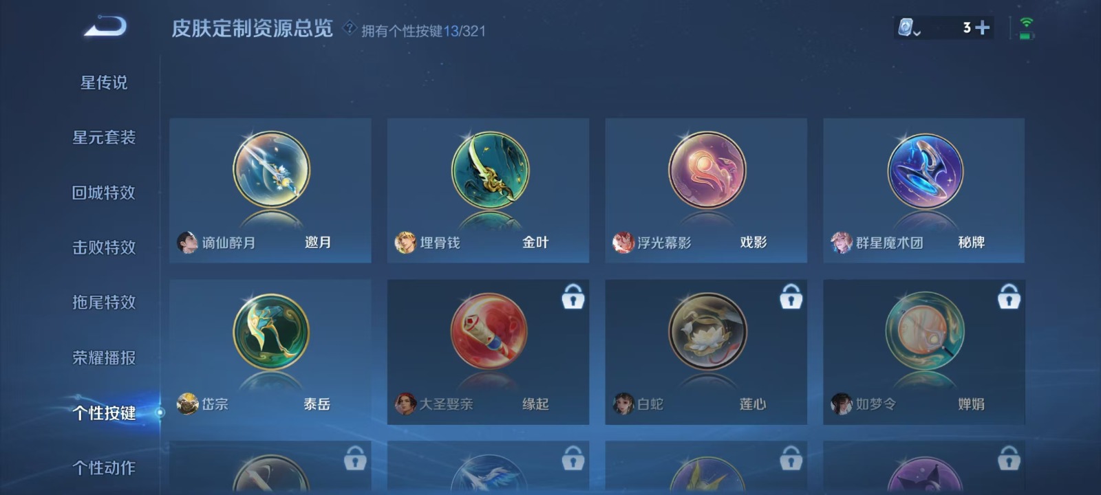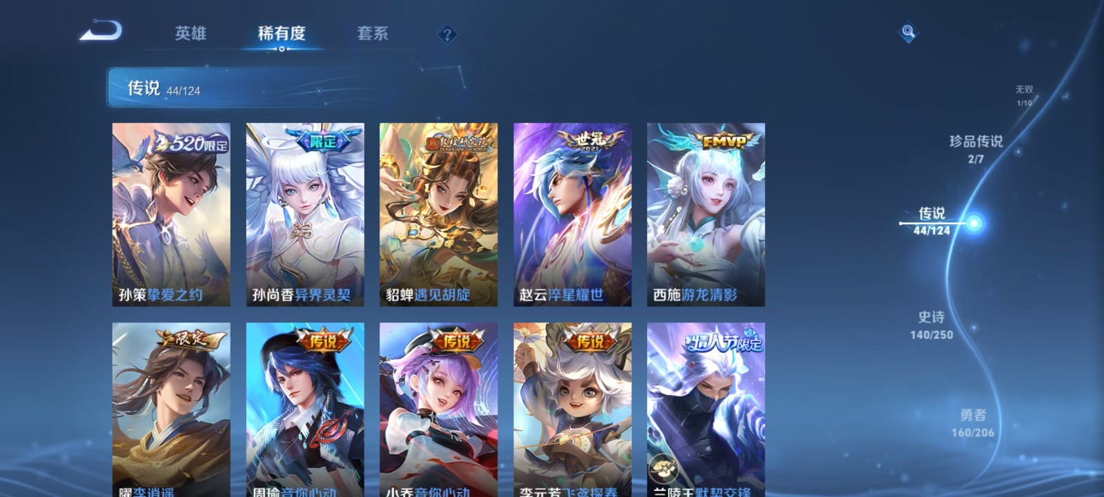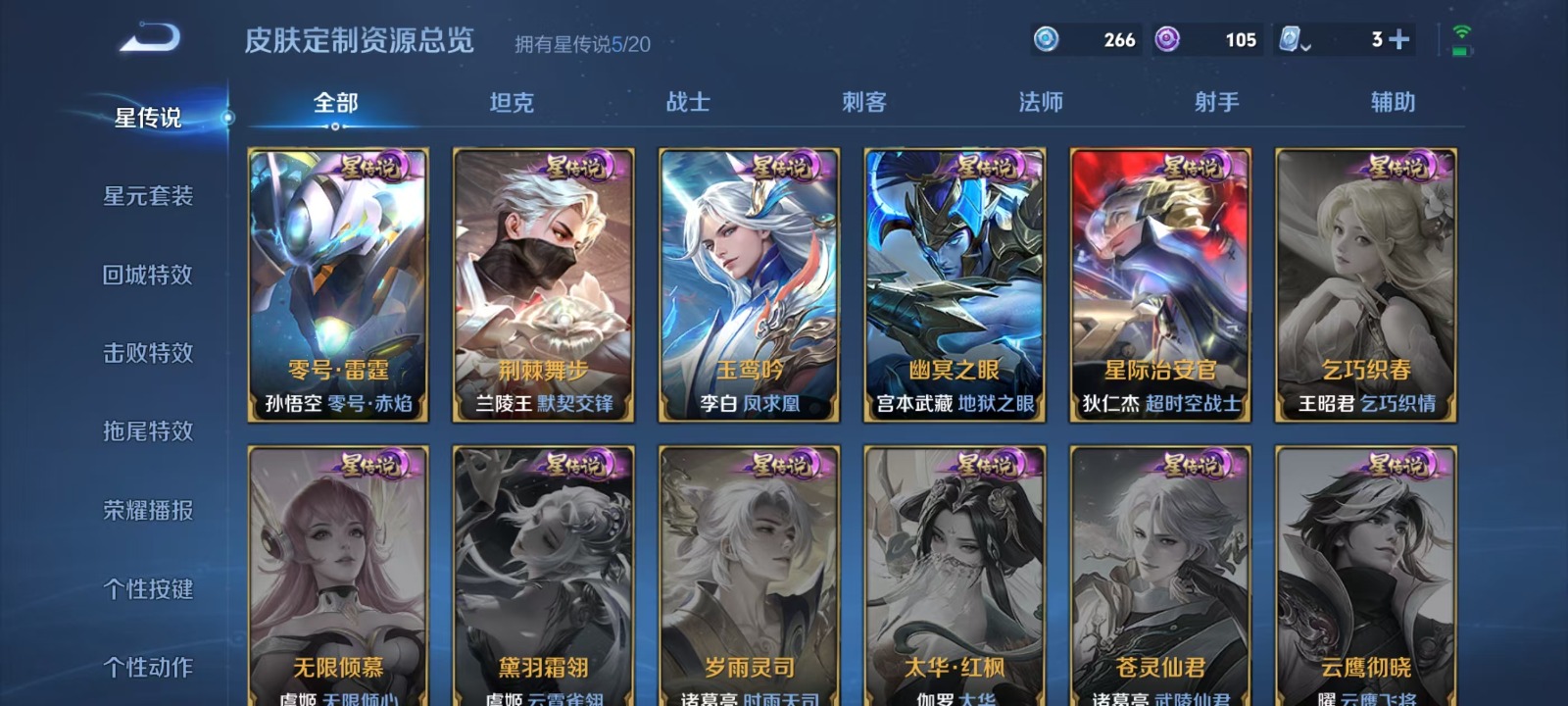 大乔白鹤梁神女,金蝉唐三藏,夏侯惇霜北刀,甄姬女儿国国王,伽罗天狼溯光者,典韦岱宗,孙尚香异界灵契,牛魔奔雷神使,鲁班七号乒乒小将,吕布御风骁将,诸葛亮时雨天司,兰陵王默契交锋,公孙离祈雪灵祝,裴擒虎李小龙,上官婉儿梁祝,花木兰默契交锋,安琪拉魔法小厨娘,马可波罗山海·玄木吟,艾琳陌上桑,西施至美·乘鲤谣,桑启鸣野蒿,孙悟空孙行者,孙悟空大圣娶亲,孙悟空至尊宝,芈月白晶晶,妲己时之彼端,韩信逐梦之影,虞姬霸王别姬,王昭君凤凰于飞,王昭君映山客