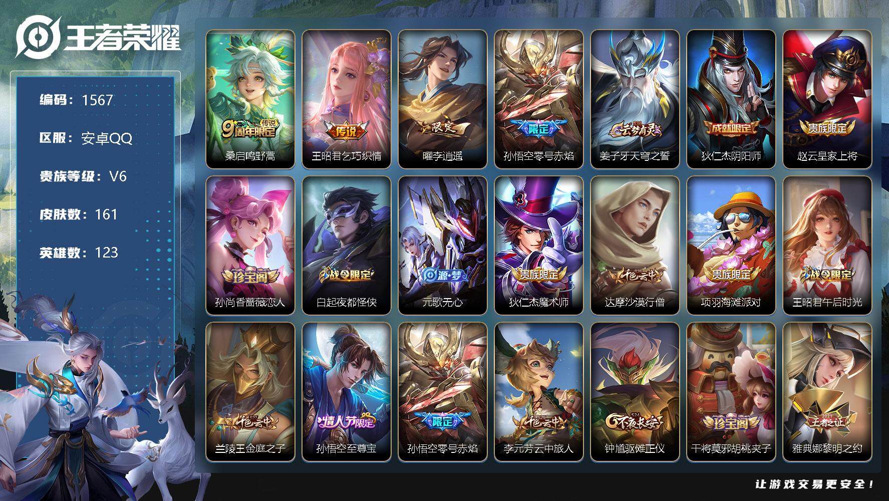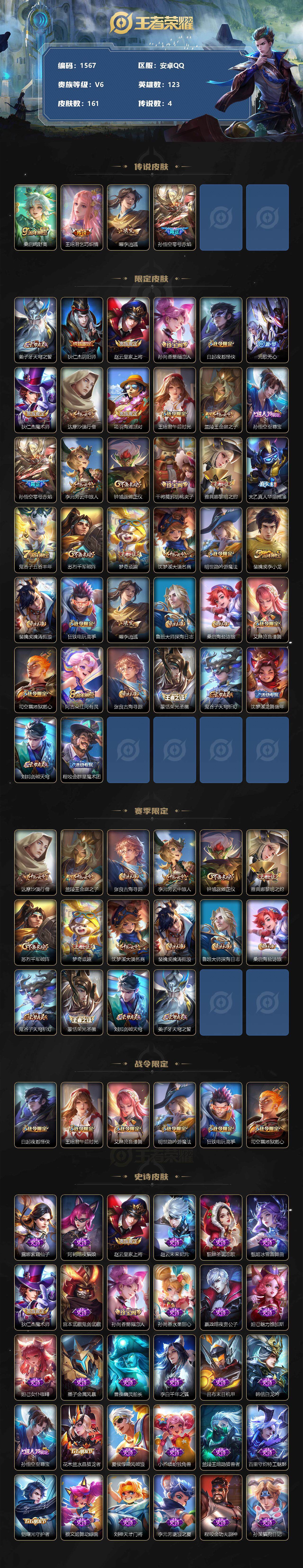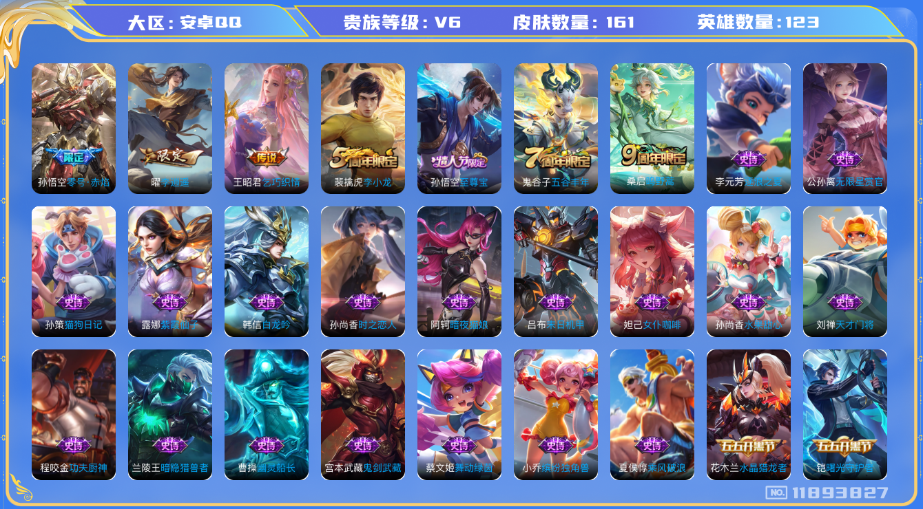 [11893827]【商品标题】:安卓Q-V6-最强王者段位-123英雄-161皮肤-0典藏-0珍品无双-0无双-0珍品传说-4传说-46史诗