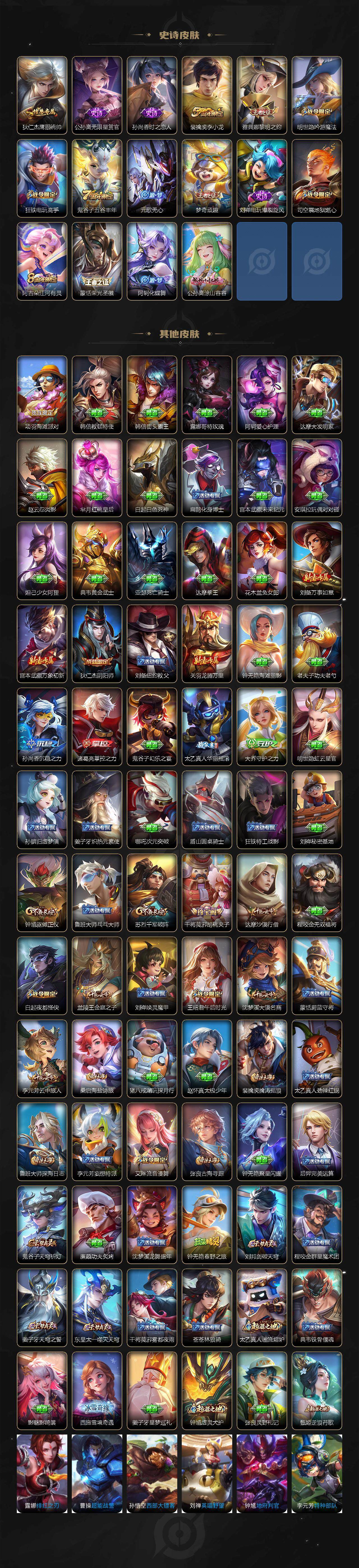 【史诗皮肤】:露娜紫霞仙子,阿轲暗夜猫娘,赵云皇家上将,赵云未来纪元,貂蝉圣诞恋歌,甄姬冰雪圆舞曲,狄仁杰魔术师,宫本武藏鬼剑武藏,孙尚香蔷薇恋人,孙尚香水果甜心,嬴政暗夜贵公子,妲己魅力维加斯,妲己女仆咖啡,墨子金属风暴,曹操幽灵船长,李白千年之狐,吕布末日机甲,韩信白龙吟,孙悟空至尊宝,花木兰水晶猎龙者,夏侯惇乘风破浪,小乔缤纷独角兽,兰陵王暗隐猎兽者,百里守约特工魅影,铠曙光守护者,蔡文姬舞动绿茵,刘禅天才门将,李元芳逐浪之夏,程咬金功夫厨神,孙策猫狗日记,狄仁杰鹰眼统帅,公孙离无限星赏官,孙尚香时之恋人,裴擒虎李小龙,雅典娜黎明之约,明世隐吟游魔法,狂铁电玩高手,鬼谷子五谷丰年,元歌无心,梦奇顽趣,刘禅电玩爆裂旋风,司空震地狱燃心,阿古朵江河有灵,蒙恬荣光圣徽,阿轲化蝶舞,公孙离涂山容容