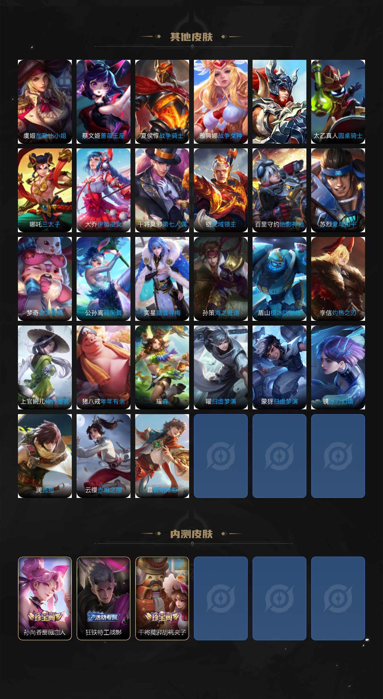 【赛季限定】:达摩沙漠行僧,兰陵王金庭之子,张良古海寻踪,李元芳云中旅人,钟馗驱傩正仪,雅典娜黎明之约,苏烈千军破阵,梦奇顽趣,沈梦溪大漠名商,裴擒虎擒涛扼浪,鲁班大师探海日志,桑启海盐诗旅,鬼谷子天穹祈灯,蒙恬荣光圣徽,刘邦剑破天穹,姜子牙天穹之誓