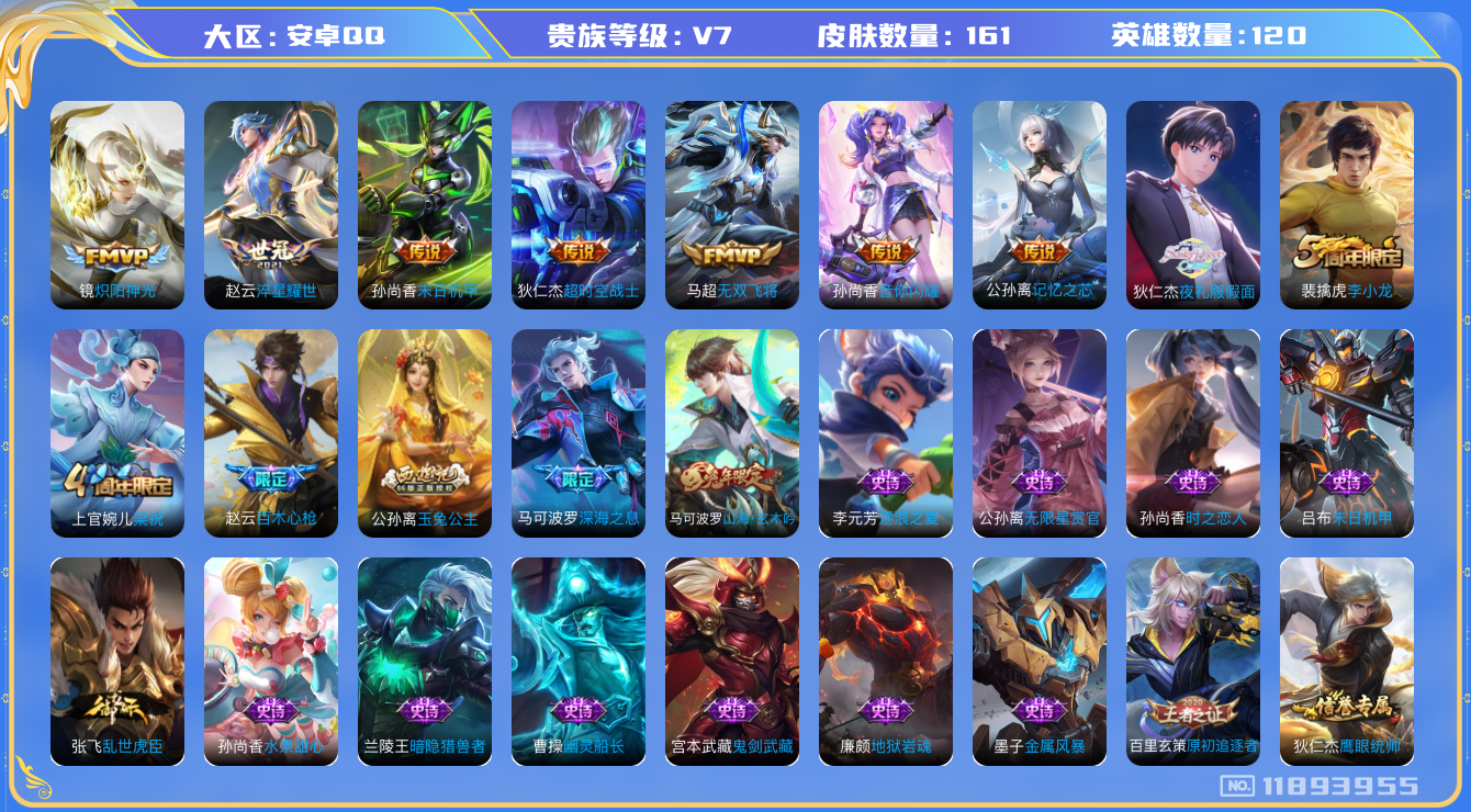 [11893955]【商品标题】:安卓Q-V0-永恒钻石III段位-120英雄-161皮肤-0典藏-0珍品无双-0无双-0珍品传说-9传说-32史诗