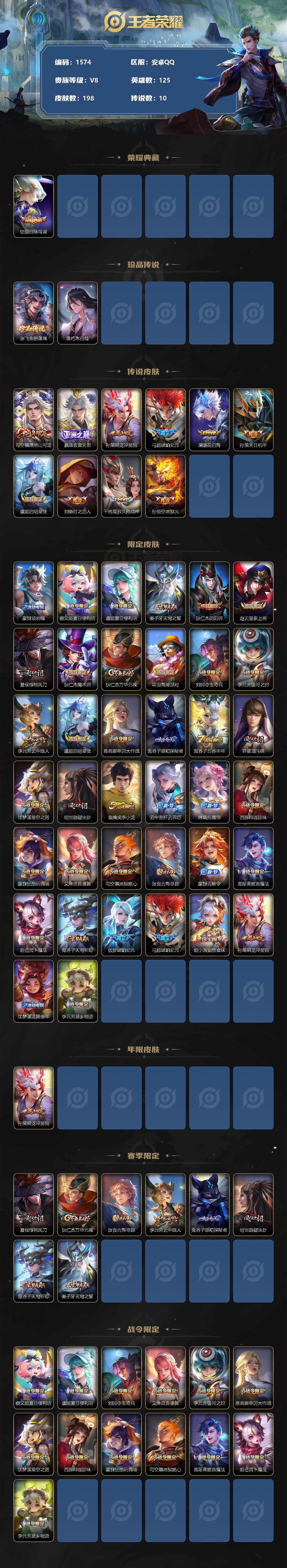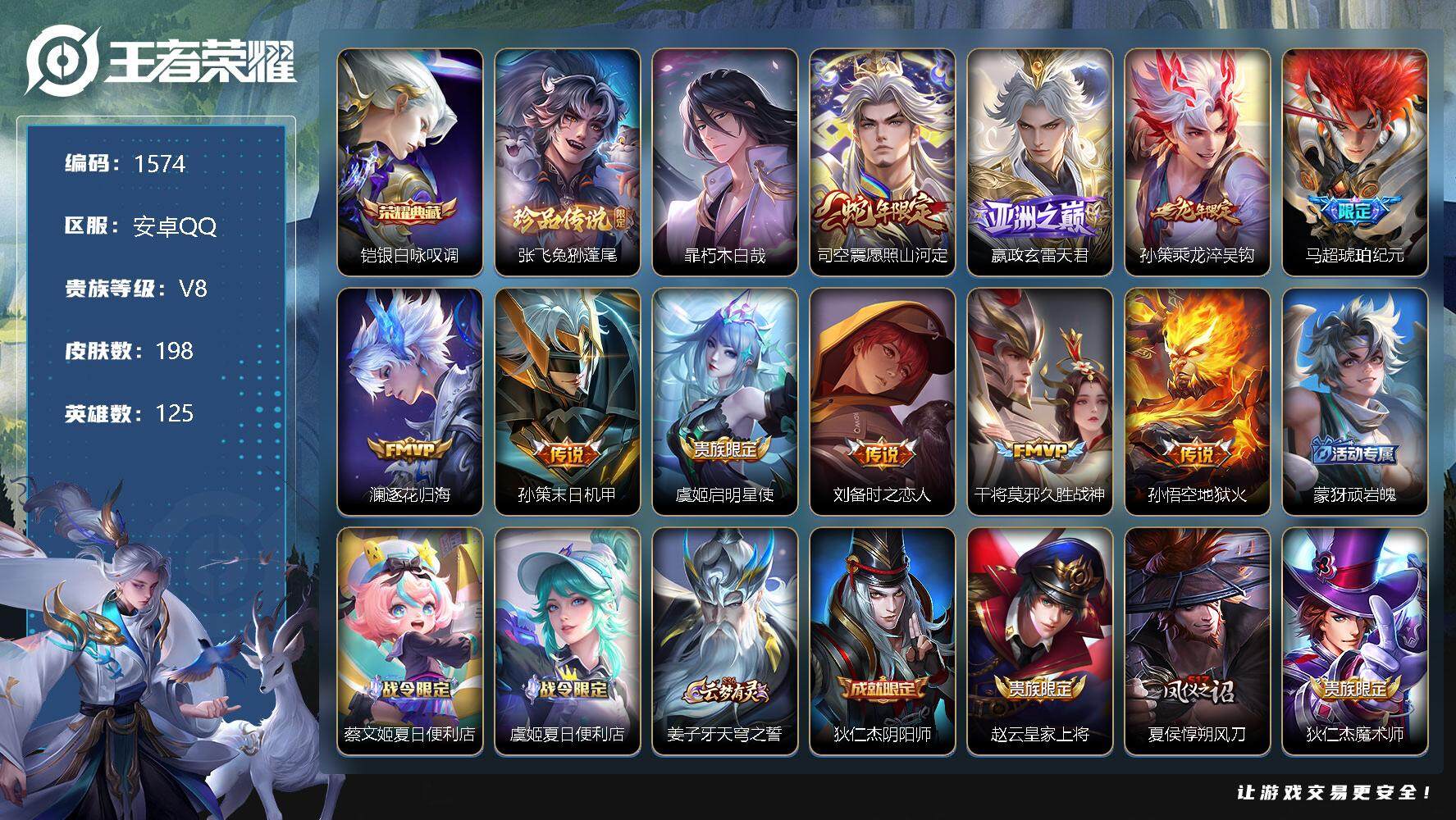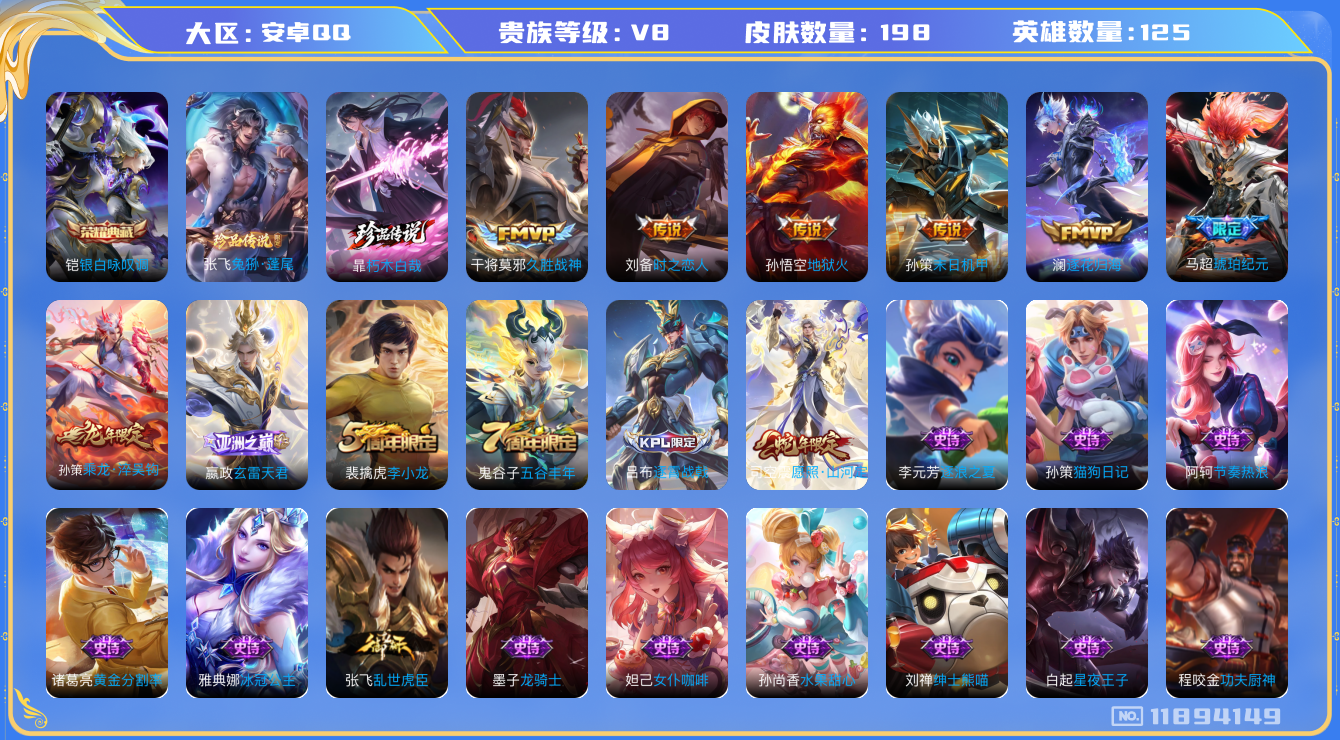 [11894149]【商品标题】:安卓Q-V8-最强王者段位-125英雄-198皮肤-1典藏-0珍品无双-0无双-2珍品传说-10传说-55史诗