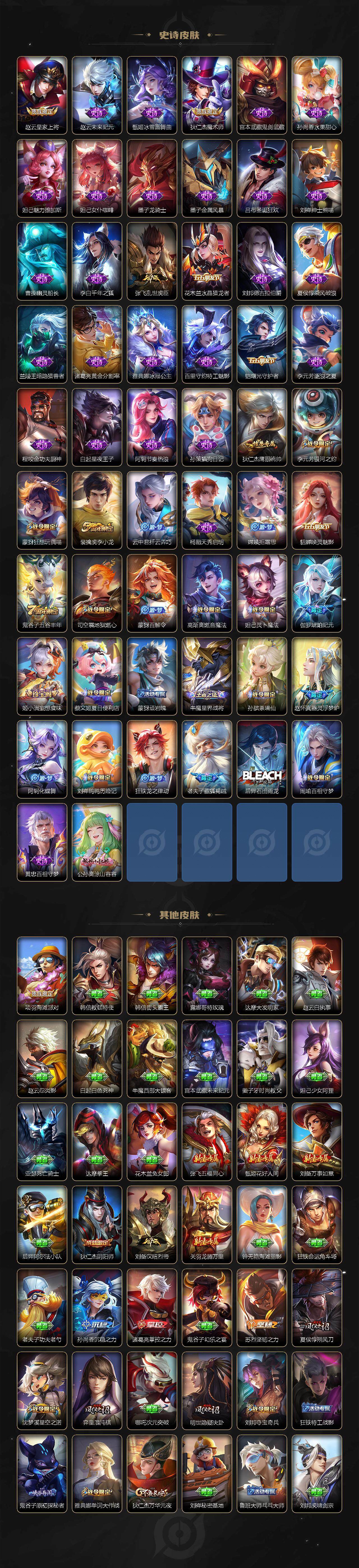 【史诗皮肤】:赵云皇家上将,赵云未来纪元,甄姬冰雪圆舞曲,狄仁杰魔术师,宫本武藏鬼剑武藏,孙尚香水果甜心,妲己魅力维加斯,妲己女仆咖啡,墨子龙骑士,墨子金属风暴,吕布圣诞狂欢,刘禅绅士熊喵,曹操幽灵船长,李白千年之狐,张飞乱世虎臣,花木兰水晶猎龙者,刘邦德古拉伯爵,夏侯惇乘风破浪,兰陵王暗隐猎兽者,诸葛亮黄金分割率,雅典娜冰冠公主,百里守约特工魅影,铠曙光守护者,李元芳逐浪之夏,程咬金功夫厨神,白起星夜王子,阿轲节奏热浪,孙策猫狗日记,狄仁杰鹰眼统帅,李元芳银河之约,蒙犽狂想玩偶喵,裴擒虎李小龙,云中君纤云弄巧,杨戬天秀启明,嫦娥拒霜思,貂蝉唤灵魅影,鬼谷子五谷丰年,司空震地狱燃心,蒙犽百解令,妲己灵卜魔法,高渐离燃音魔法,伽罗琥珀纪元,姬小满妄想食味,