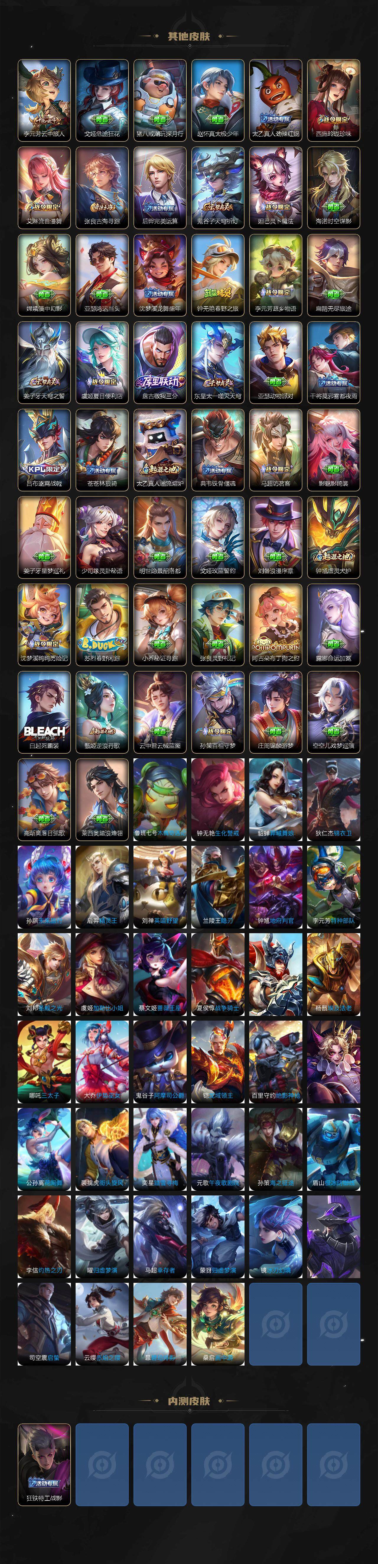 【限定皮肤】:蒙犽顽岩魄,蔡文姬夏日便利店,虞姬夏日便利店,姜子牙天穹之誓,狄仁杰阴阳师,赵云皇家上将,夏侯惇朔风刀,狄仁杰魔术师,狄仁杰万华元夜,项羽海滩派对,刘邦夺宝奇兵,李元芳银河之约,李元芳云中旅人,虞姬启明星使,雅典娜单词大作战,鬼谷子原初探秘者,鬼谷子五谷丰年,弈星混沌棋,沈梦溪星空之诺,明世隐疑决卦,裴擒虎李小龙,云中君纤云弄巧,嫦娥拒霜思,西施玲珑珍味,蒙犽狂想玩偶喵,艾琳流音漫舞,司空震地狱燃心,张良古海寻踪,蒙犽百解令,高渐离燃音魔法,妲己灵卜魔法,鬼谷子天穹祈灯,伽罗琥珀纪元,马超琥珀纪元,姬小满妄想食味,孙策乘龙淬吴钩,沈梦溪龙舞盛年,李元芳蔬乡物语